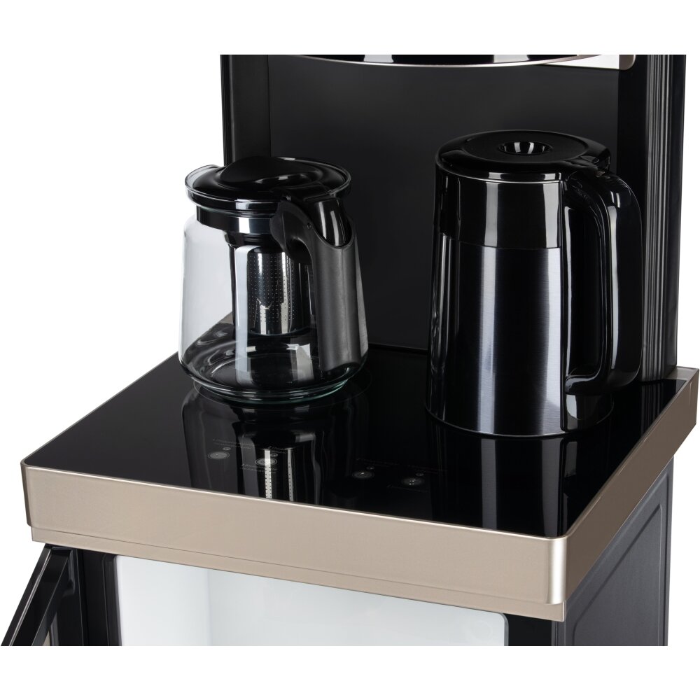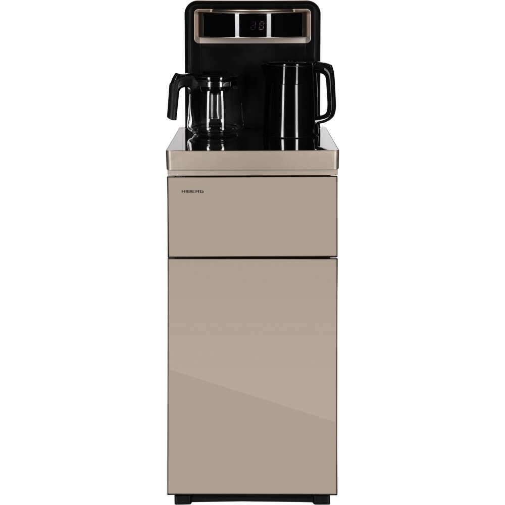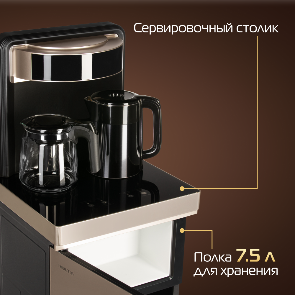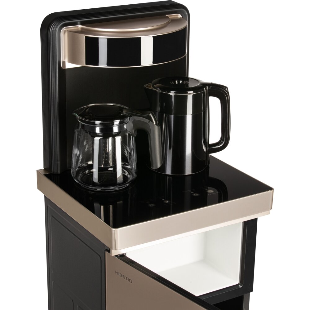 Кулер для воды HIBERG UF 95 Gold напольный, электронное охлаждение, столешница с двумя чайниками, нижняя загрузка бутыли, сенсорное управление, цвет золотистый