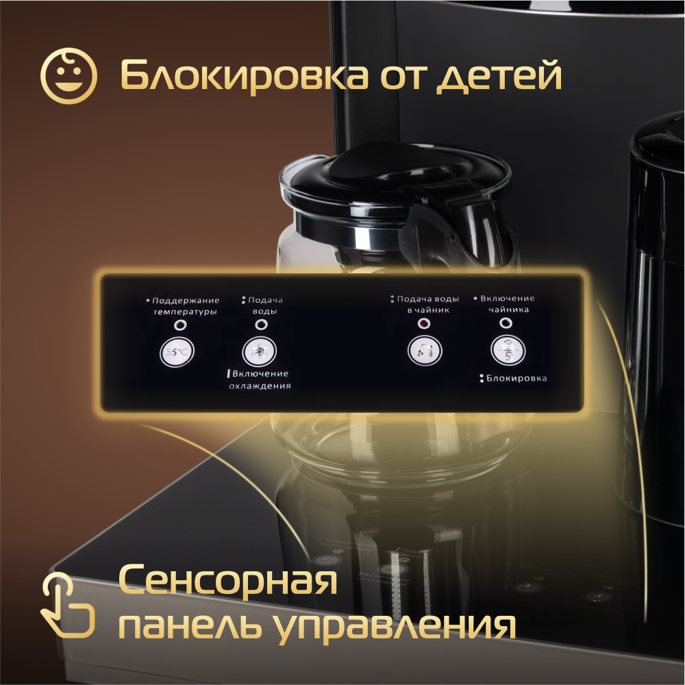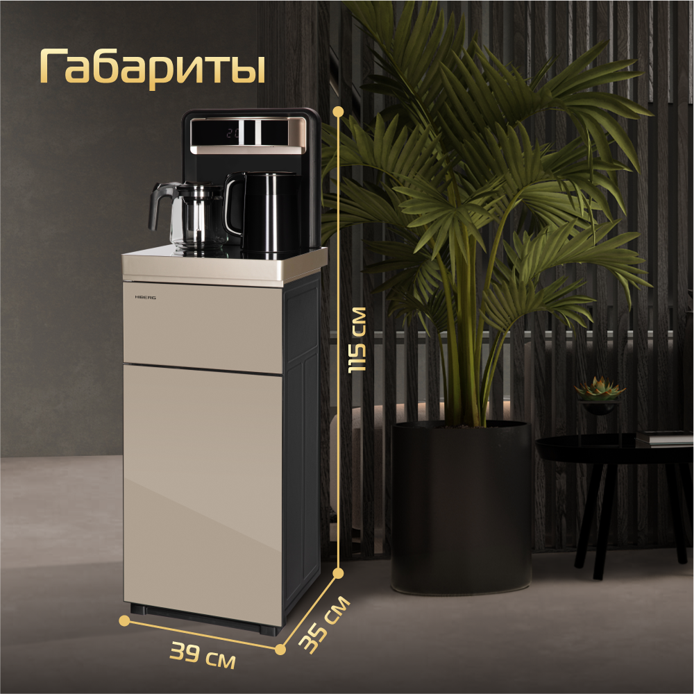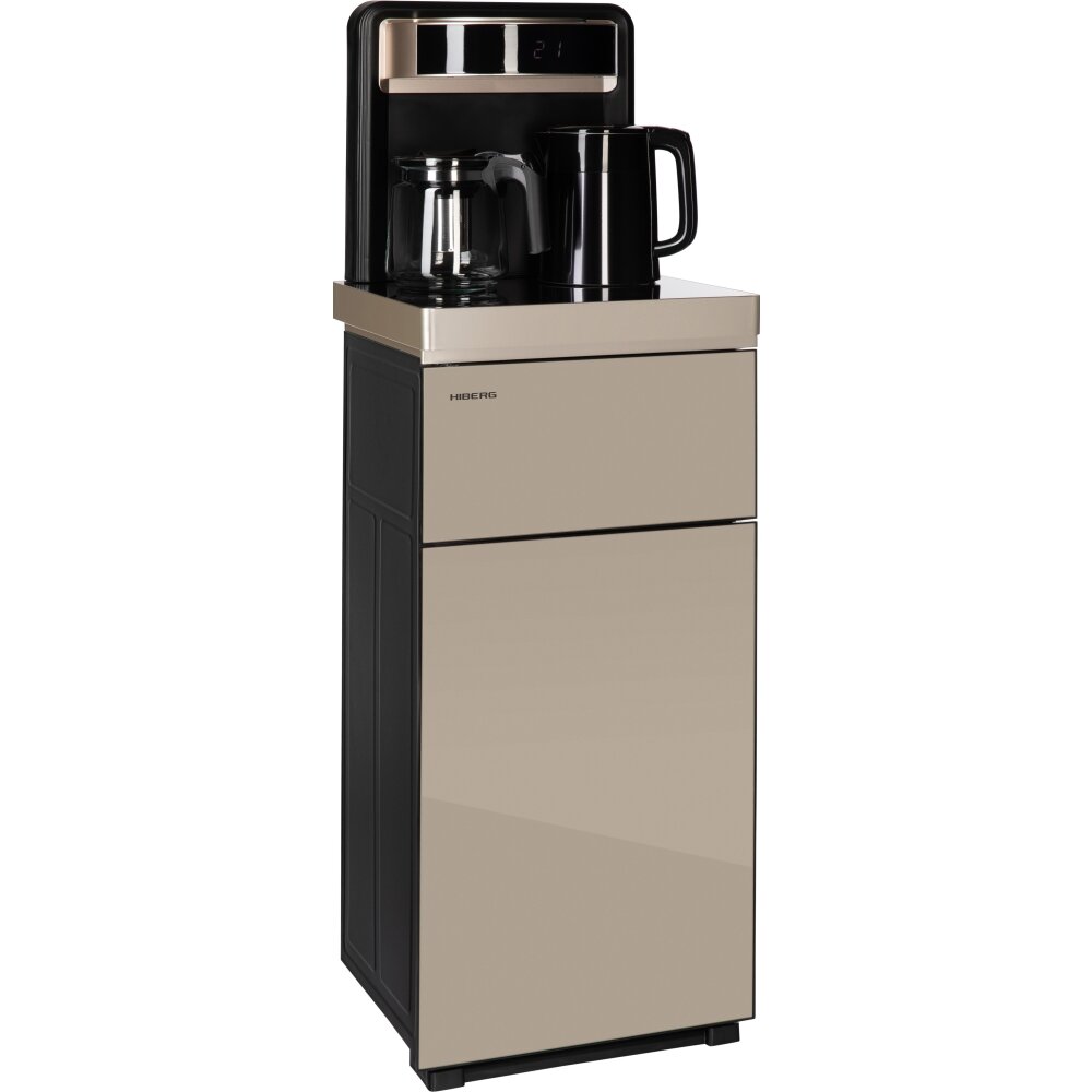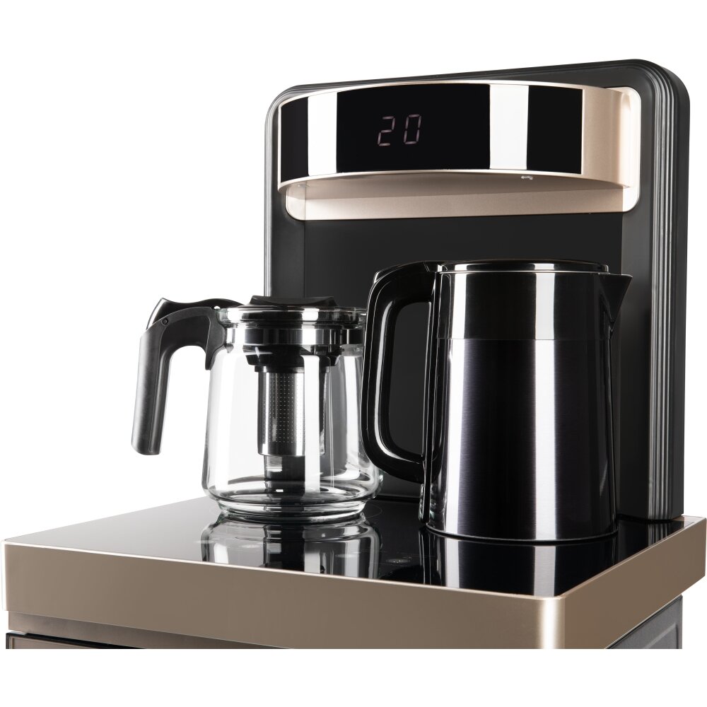 Кулер для воды HIBERG UF 95 Gold напольный, электронное охлаждение, столешница с двумя чайниками, нижняя загрузка бутыли, сенсорное управление, цвет золотистый