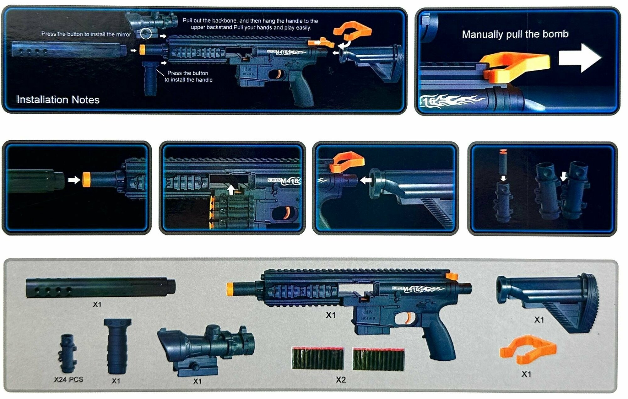 | Тип боеприпасов | гидрогелевые шарики / мягкие пули / мягкие шарики / патроны / пули / ракеты |
