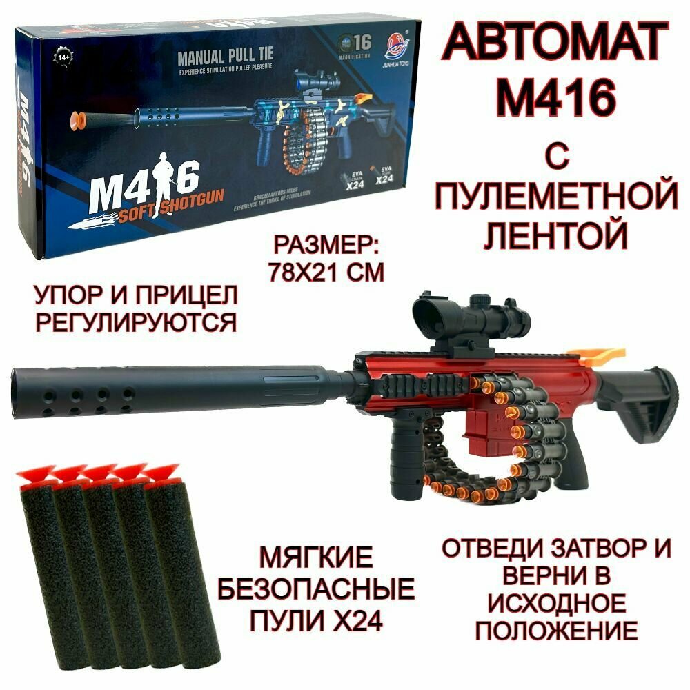 Купить Автомат М416 стреляет мягкими пулями, пулемет с глушителем, с пулеметной лентой, бластер с патронами, винтовка с прицелом, детское оружие, 78 см