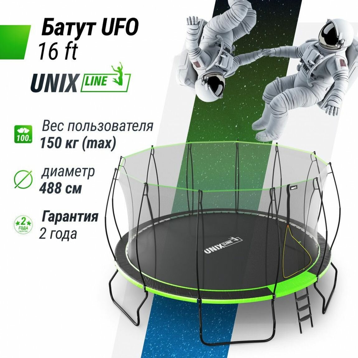 Купить Батут каркасный UNIX Line UFO 16 ft Green, диаметр 488 см, до 150 кг, с внутренней защитной сеткой, для дома и улицы, лестница в комплекте