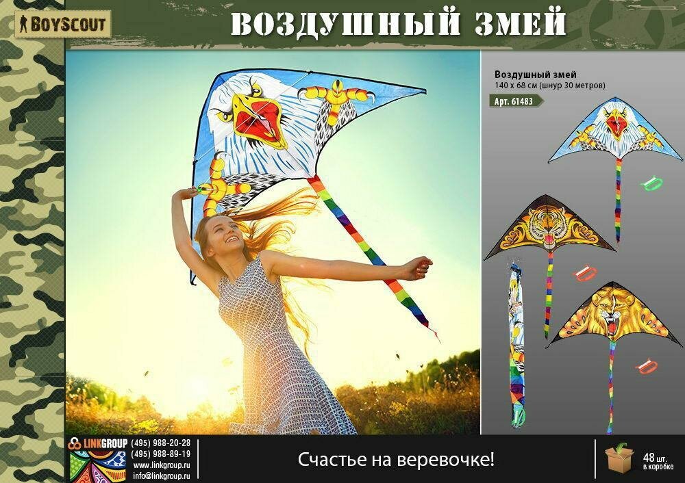 Ниже Вы можете прочитать отзывы на Змей воздушный BOYSCOUT 130х62 см, шнур 30 метров (3 вида в коробке: Лев, Тигр, Орел) 61483, ознакомится с подробными характеристиками, посмотреть интересные обзоры и фотографии на Змей воздушный BOYSCOUT 130х62 см, шнур 30 метров (3 вида в коробке: Лев, Тигр, Орел) 61483.