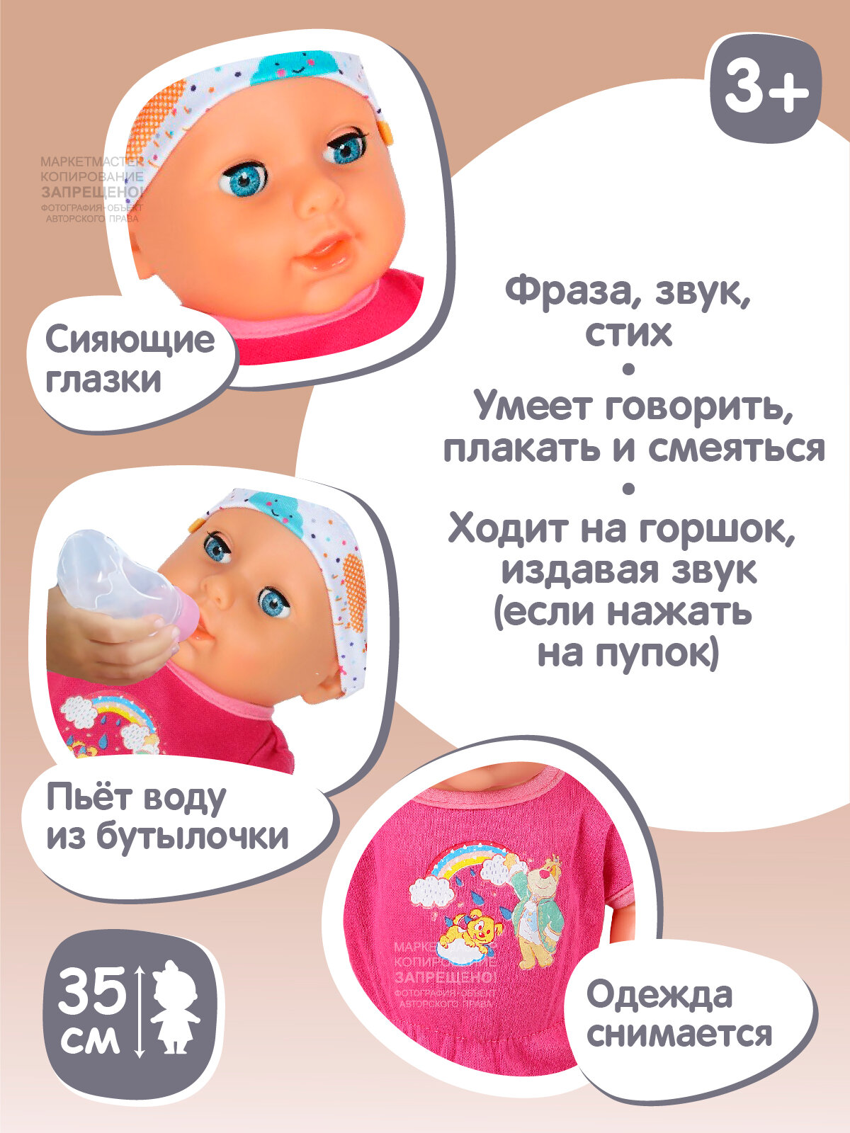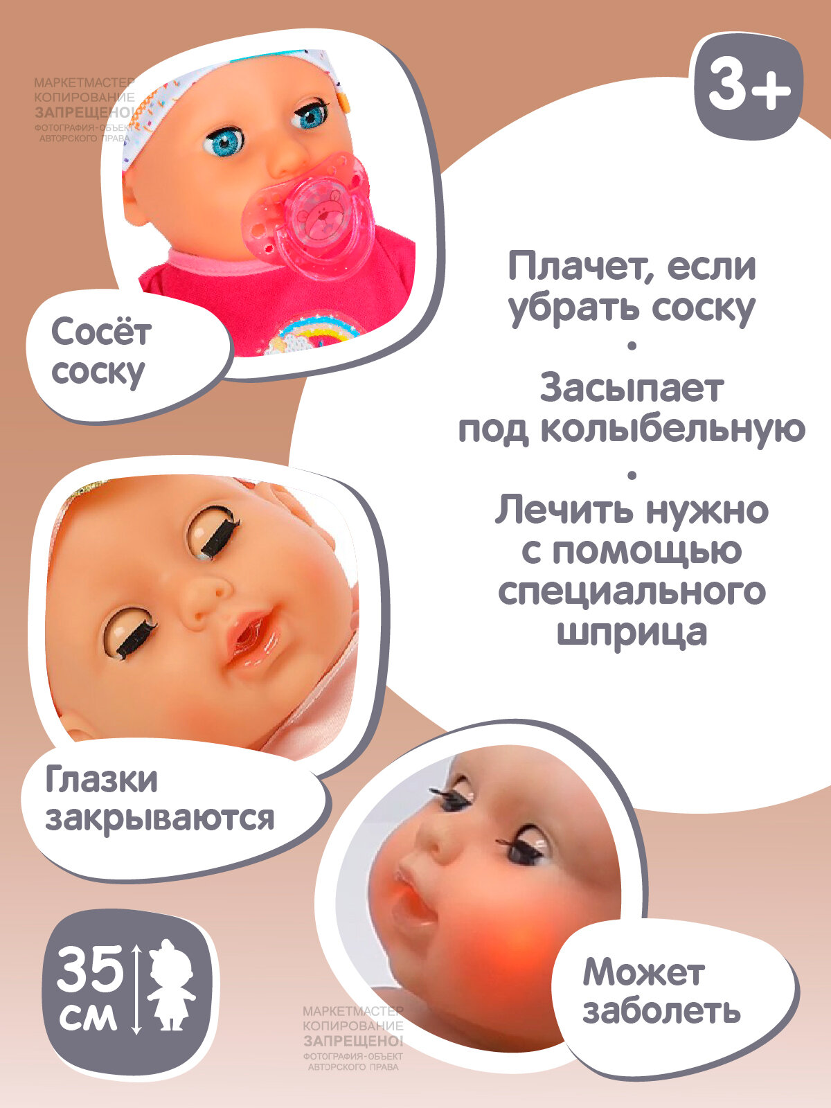 | Комплектация | кукла, горшок, стетоскоп, шприц, соска, бутылочка, градусник, браслет на ручку |