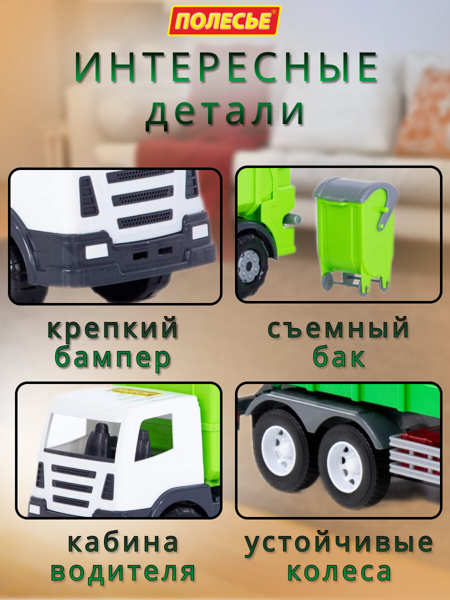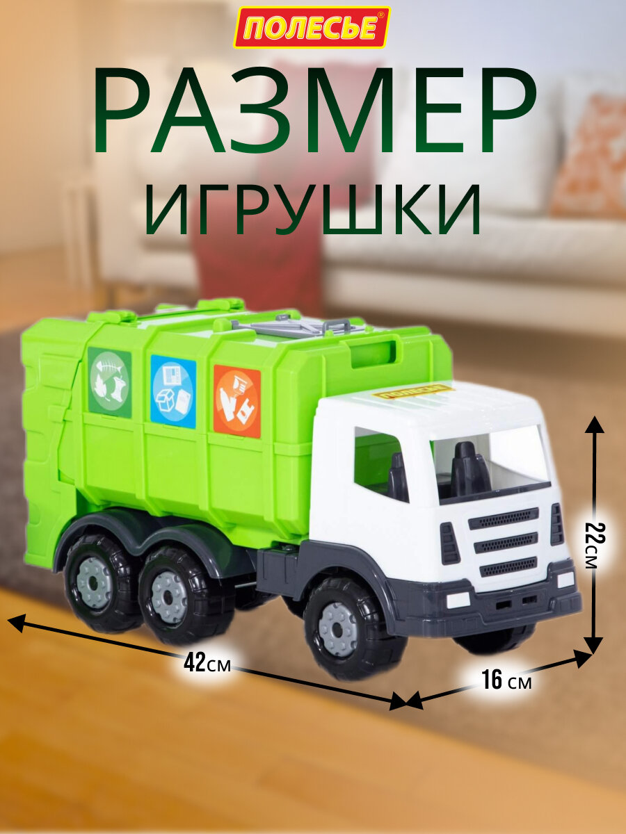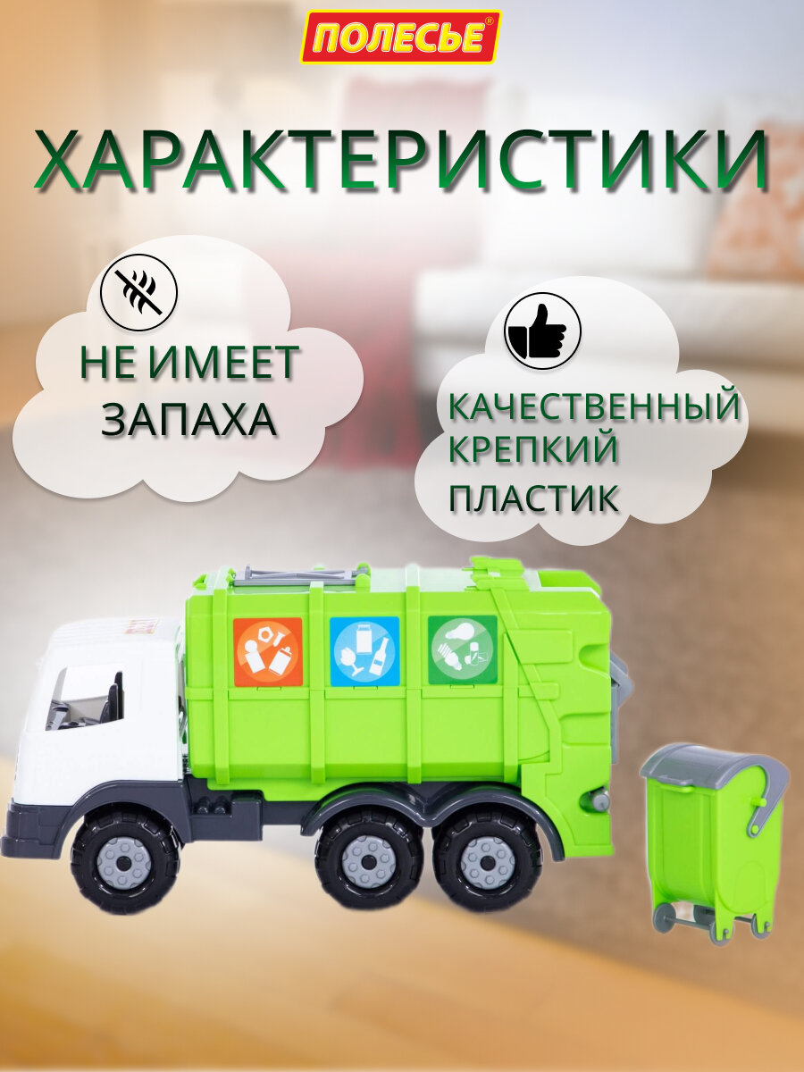 | Дополнительная информация | размер мусоровоза: 47.5 х 16.5 х 22.2 см (с контейнером); 42 х 16.5 х 22.2 см (без контейнера) |