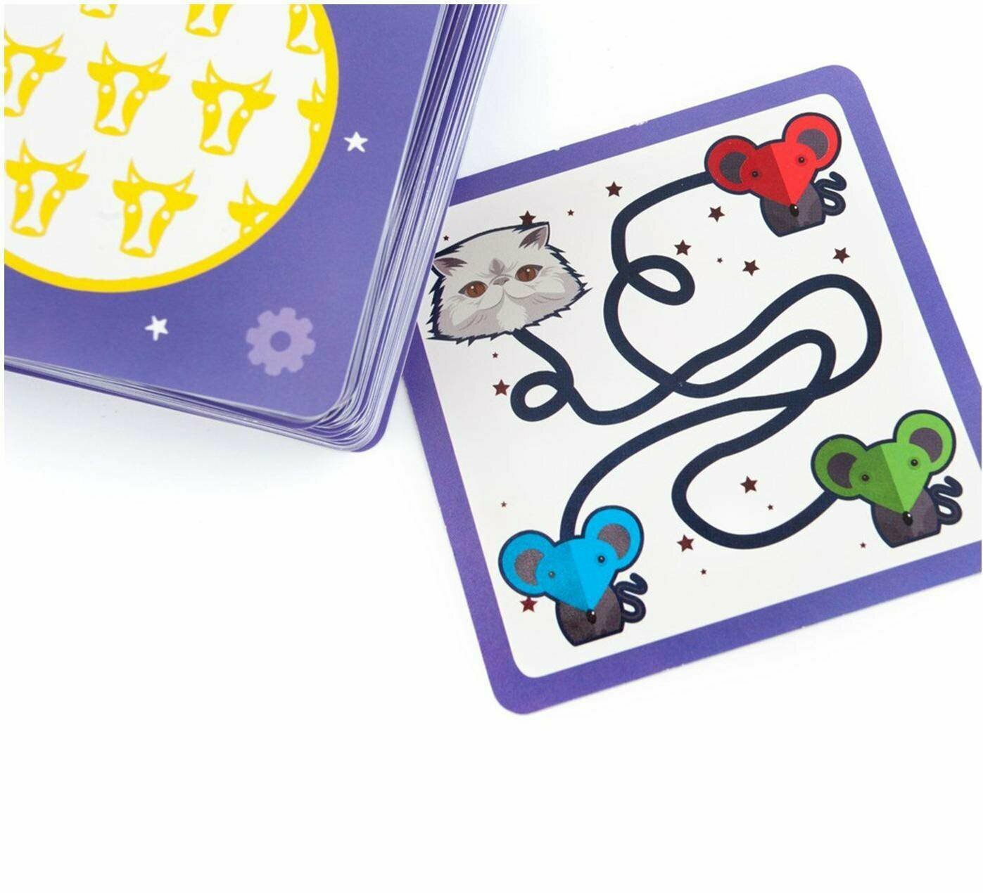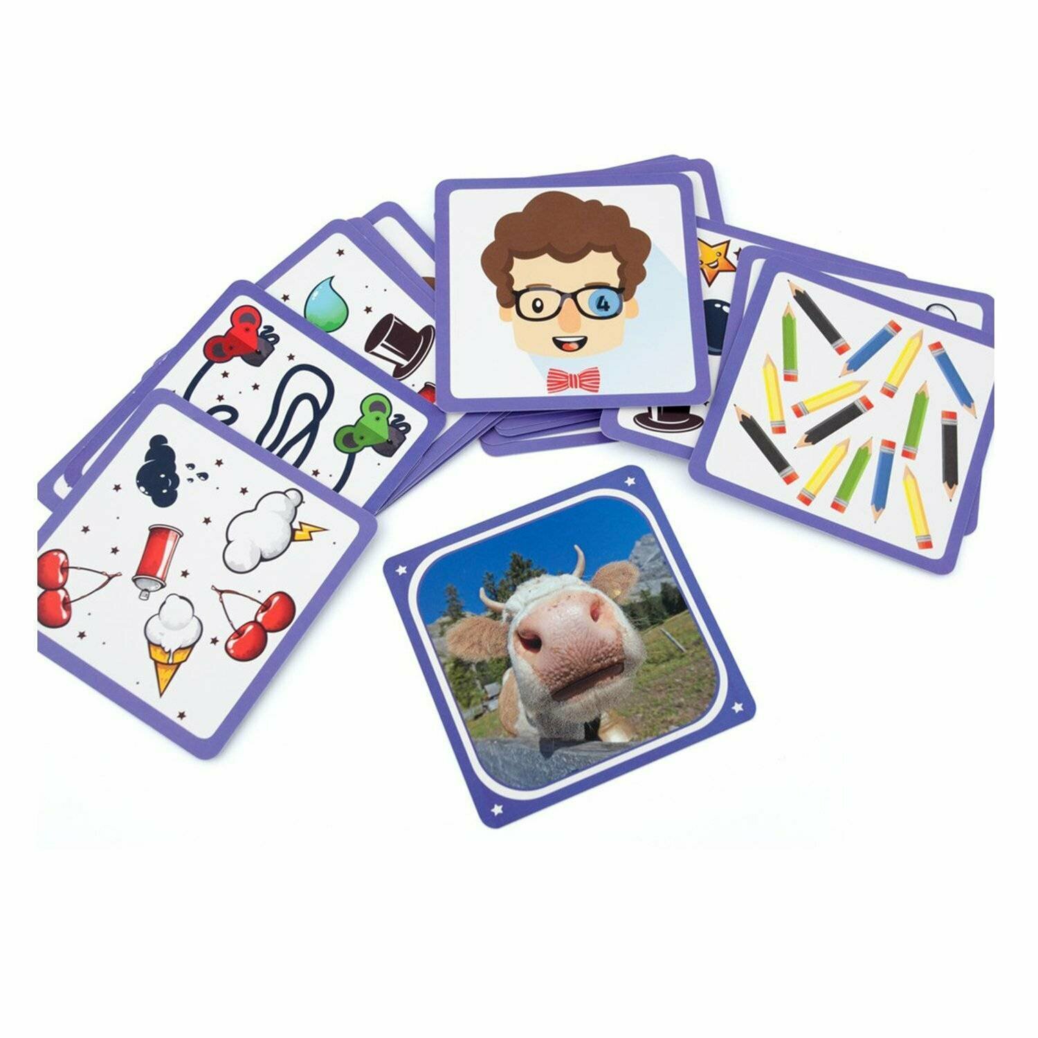 | Комплектация | 90 карт (80 карт заданий, 10 тактильных карт), 24 фишки победных очков (по 6 фишек каждого цвета - фиолетового, жёлтого, оранжевого и зелёного), правила игры |