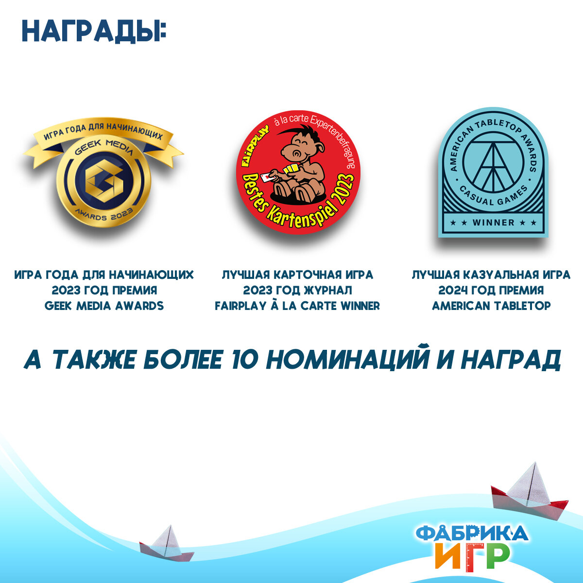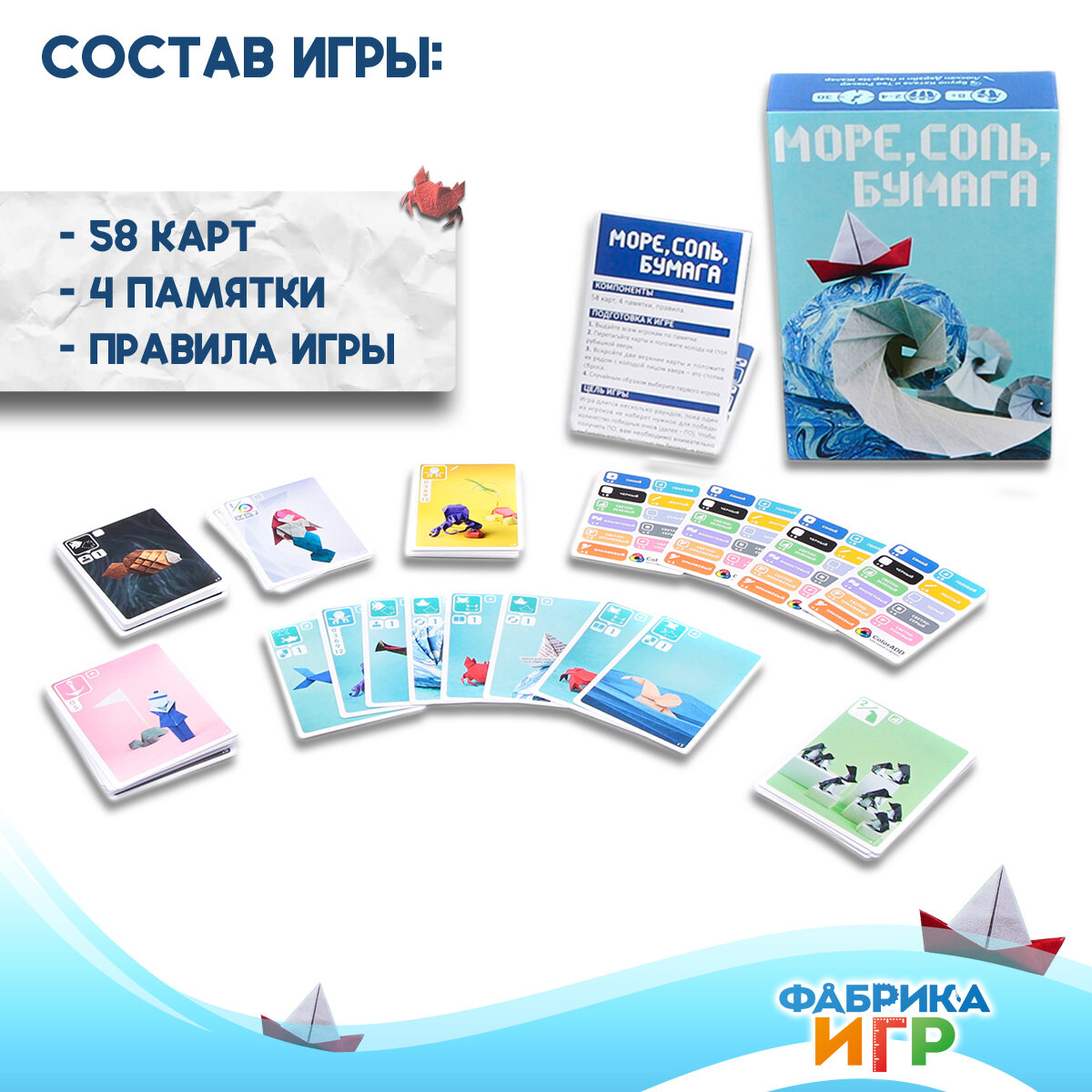 | Дополнительная информация | “Море, соль, бумага” - победила (1-е место!) в номинации “ Игра года для начинающих” на Премии Geek Media Awards 2023 |