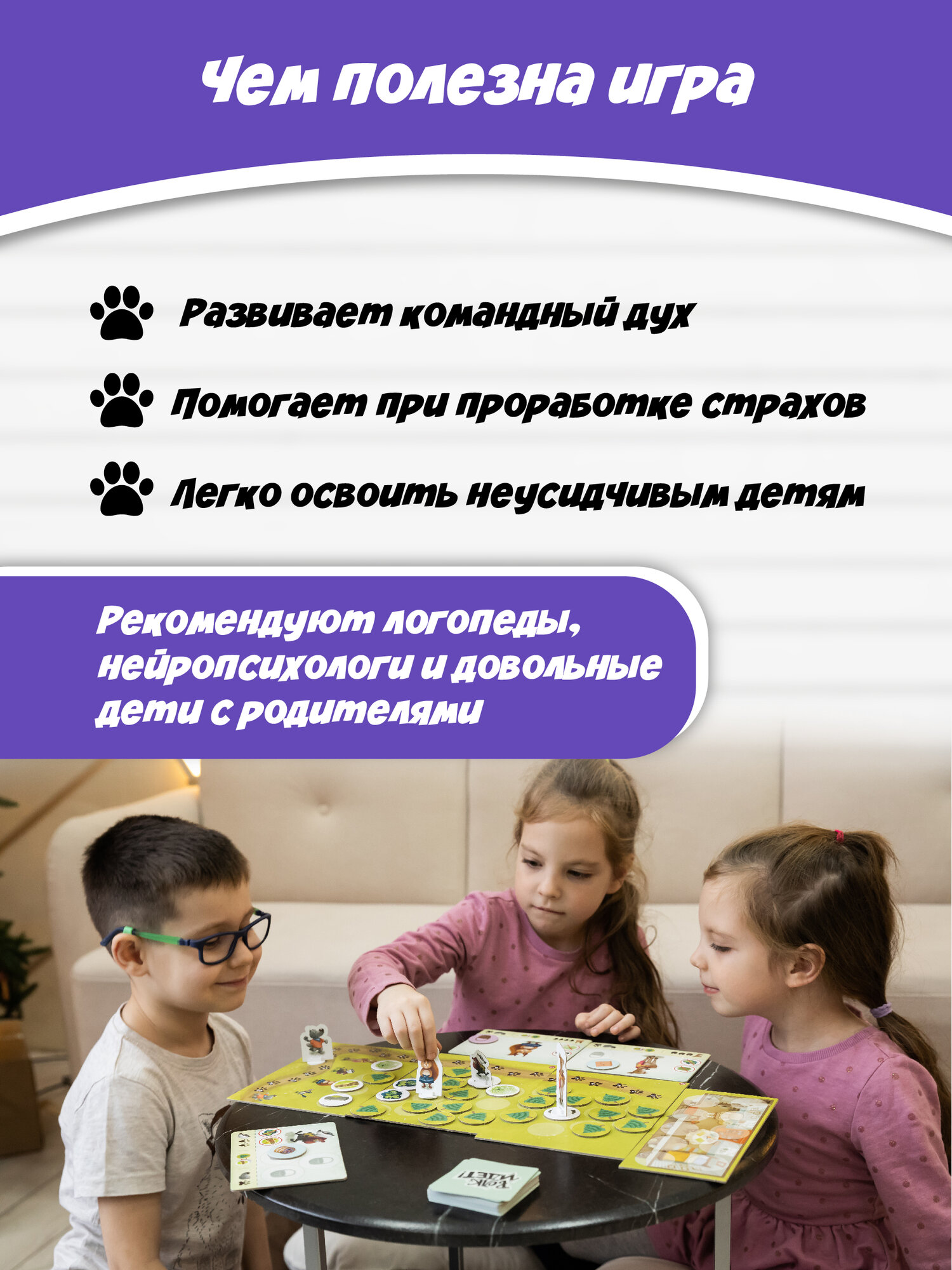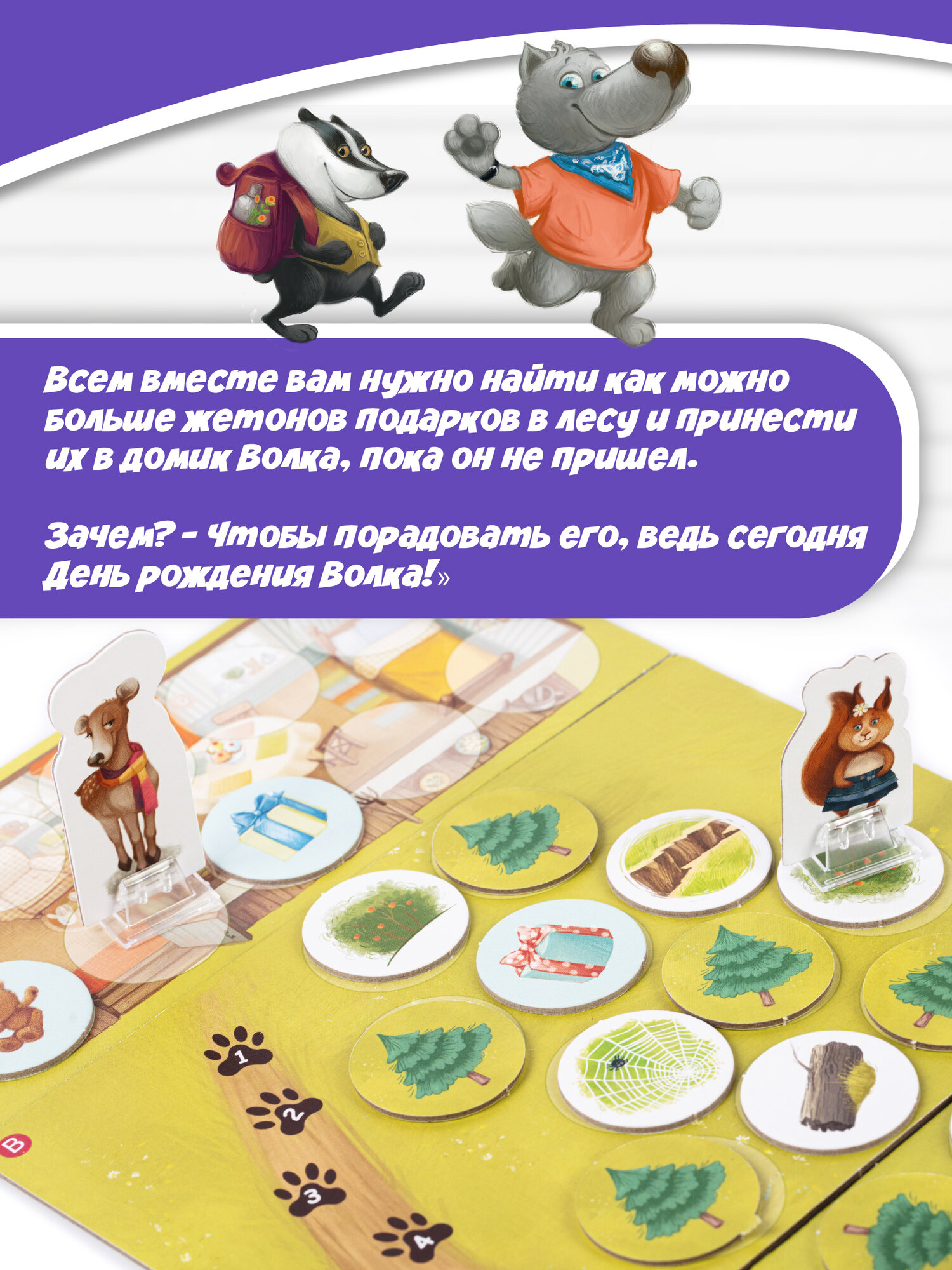| Комплектация | 5 фигурок животных с подставками, 4 планшета героев, 4 части игрового поля, 30 жетонов леса трёх видов, 30 карточек заданий, правила игры |