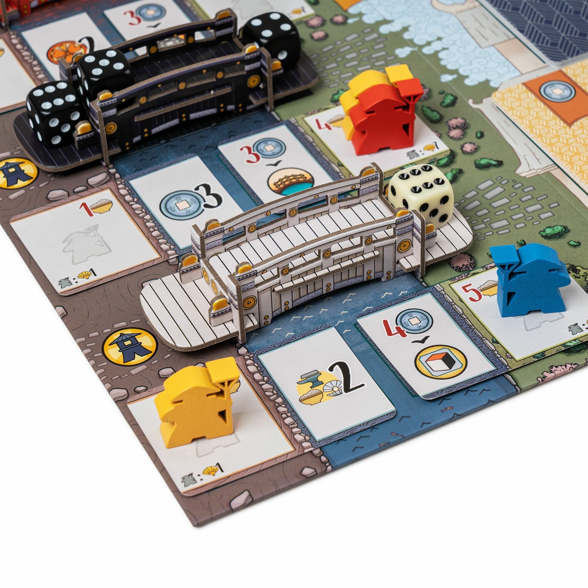 | Комплектация | Игровое поле 4 планшета игроков 77 карт 85 деревянных фишек 79 жетонов 3 сборных фигурки мостов 15 кубиков Правила игры |