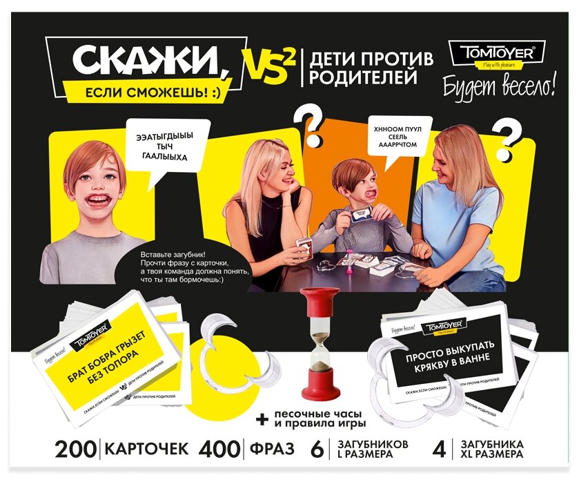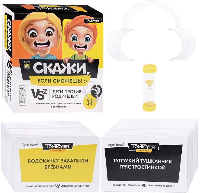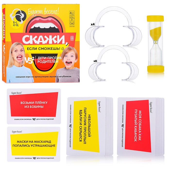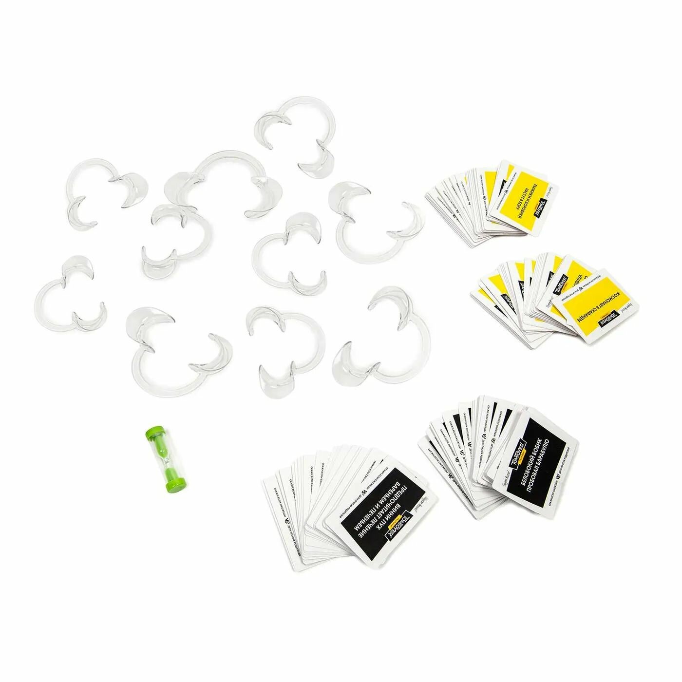 | Комплектация | 200 карточек с фразами, песочные часы, 6 загубников L размера, 4 загубника XL размера |