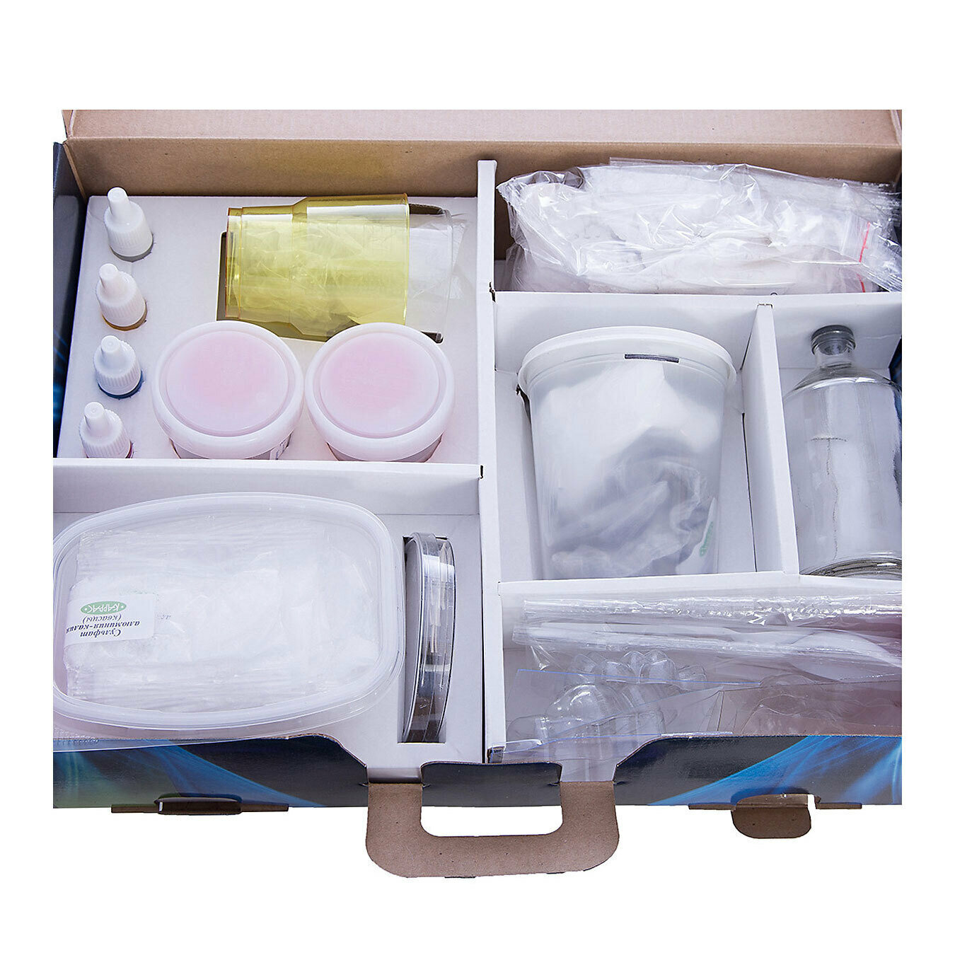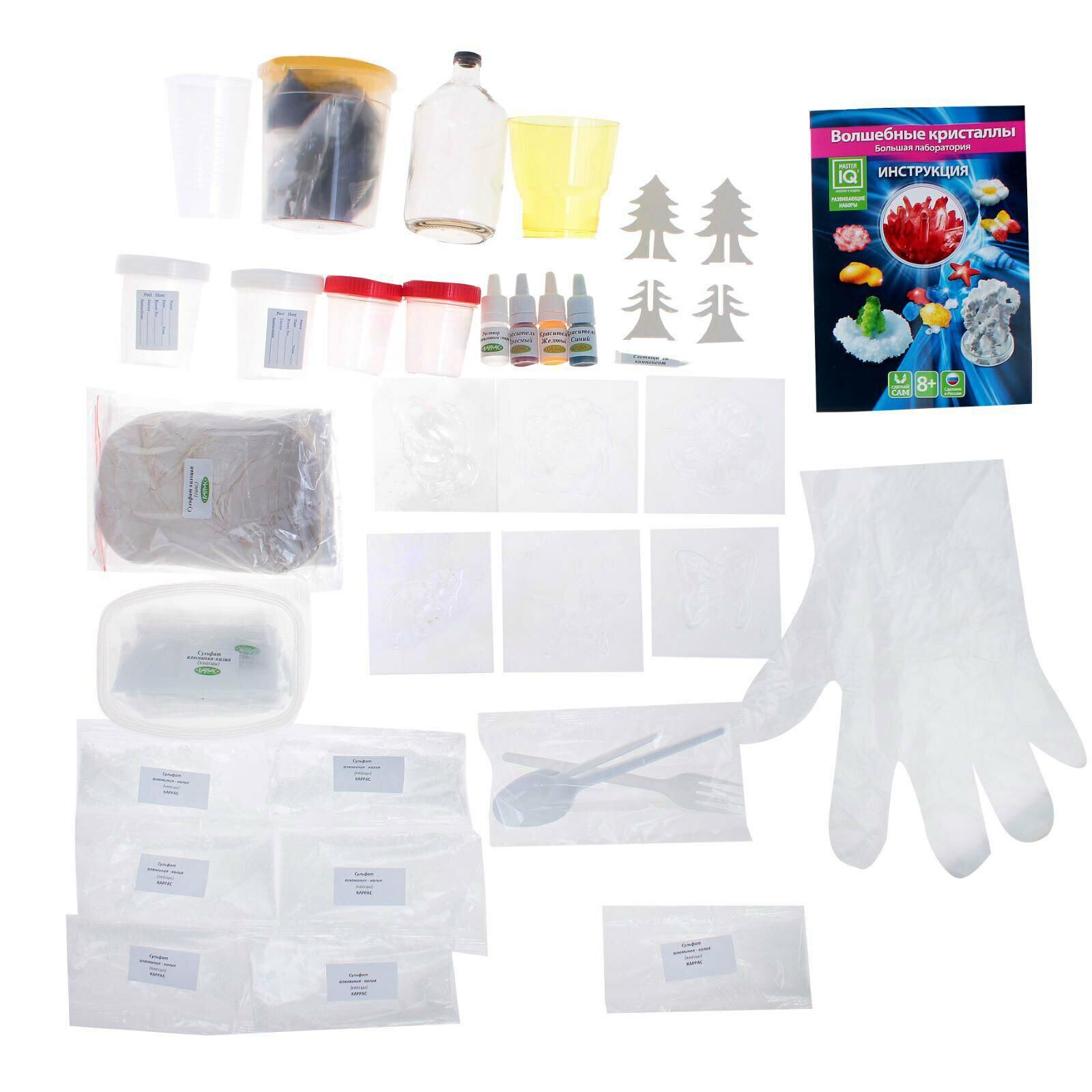 | Комплектация | ацетат натрия, карбамид, дигидроортофосфат аммония, сульфат алюминия-калия, полимерный раствор, сульфат кальция, люминофор, пищевые красители 3 шт, речная галька, мерные стаканчики с крышками 4 шт, чашка петри, пластиковые формы фигурок 6 шт, пластиковый стакан с крышкой, стеклянный флакон с пробкой, пластиковые ложечки 2 шт, пластиковая вилка, пластиковые стаканчики 2 шт, чашка для заливки, пипетка, защитные перчатки, инструкция |