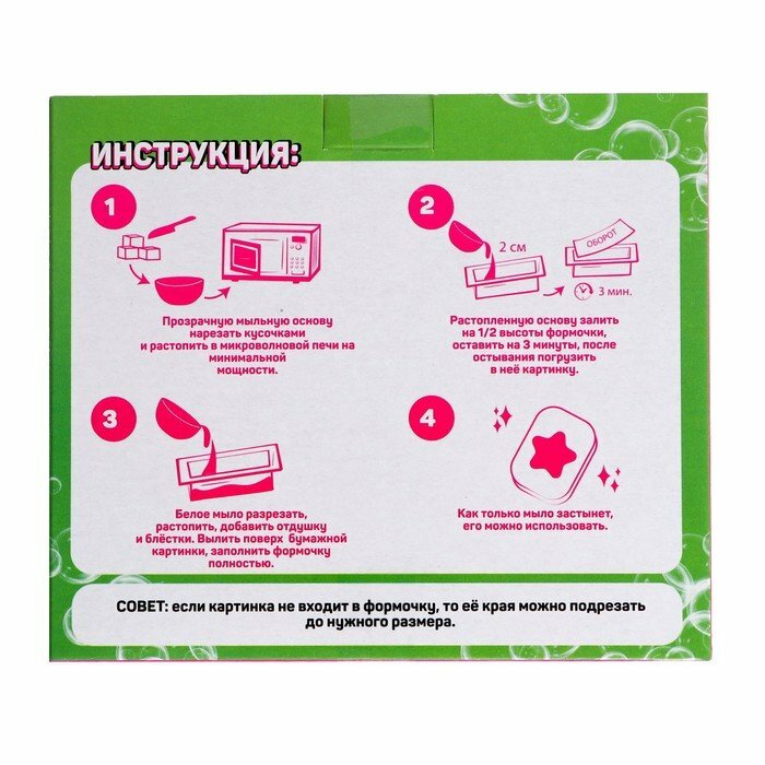 | Комплектация | формочка, мыльная основа, водорастворимая картинка, отдушка, блёстки, инструкция |