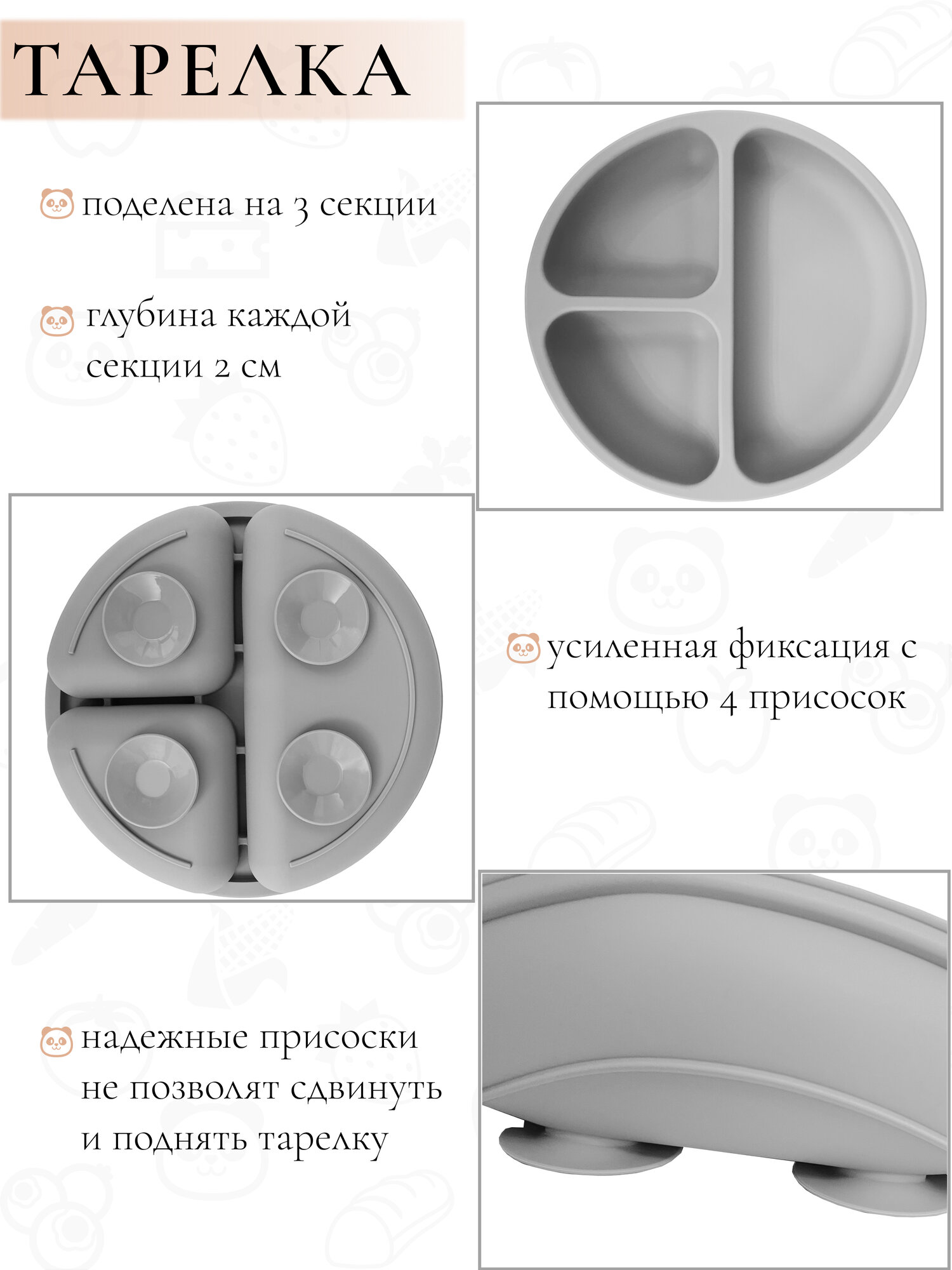 | Особенности | использование в СВЧ / можно мыть в посудомоечной машине / можно стерилизовать / на присоске / тарелка с секциями |