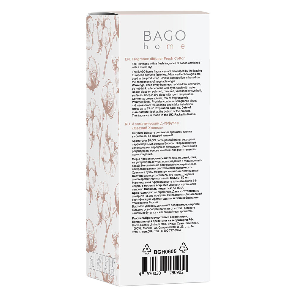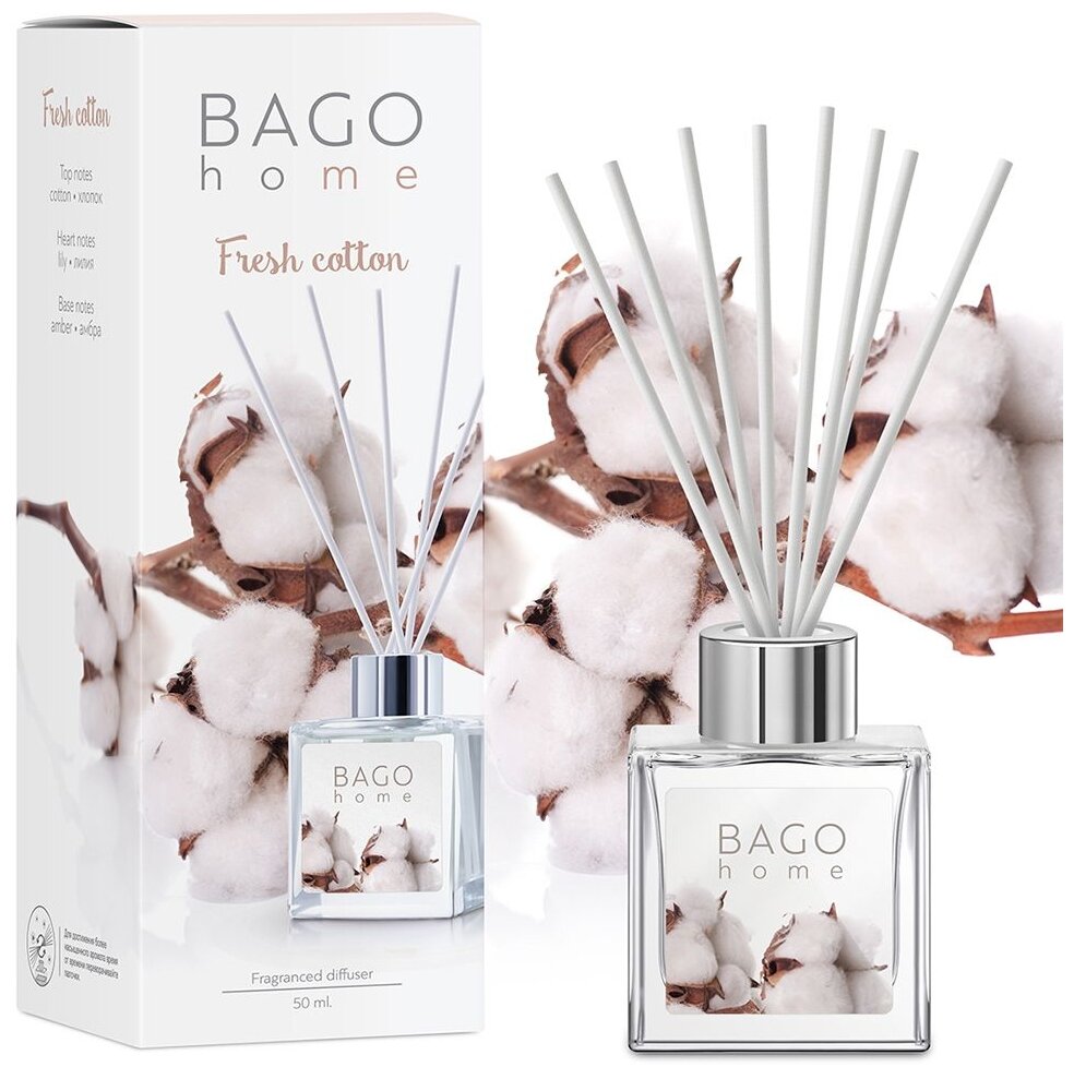 Диффузор для дома BAGO home Свежий хлопок 50 мл, без спирта, растительная основа