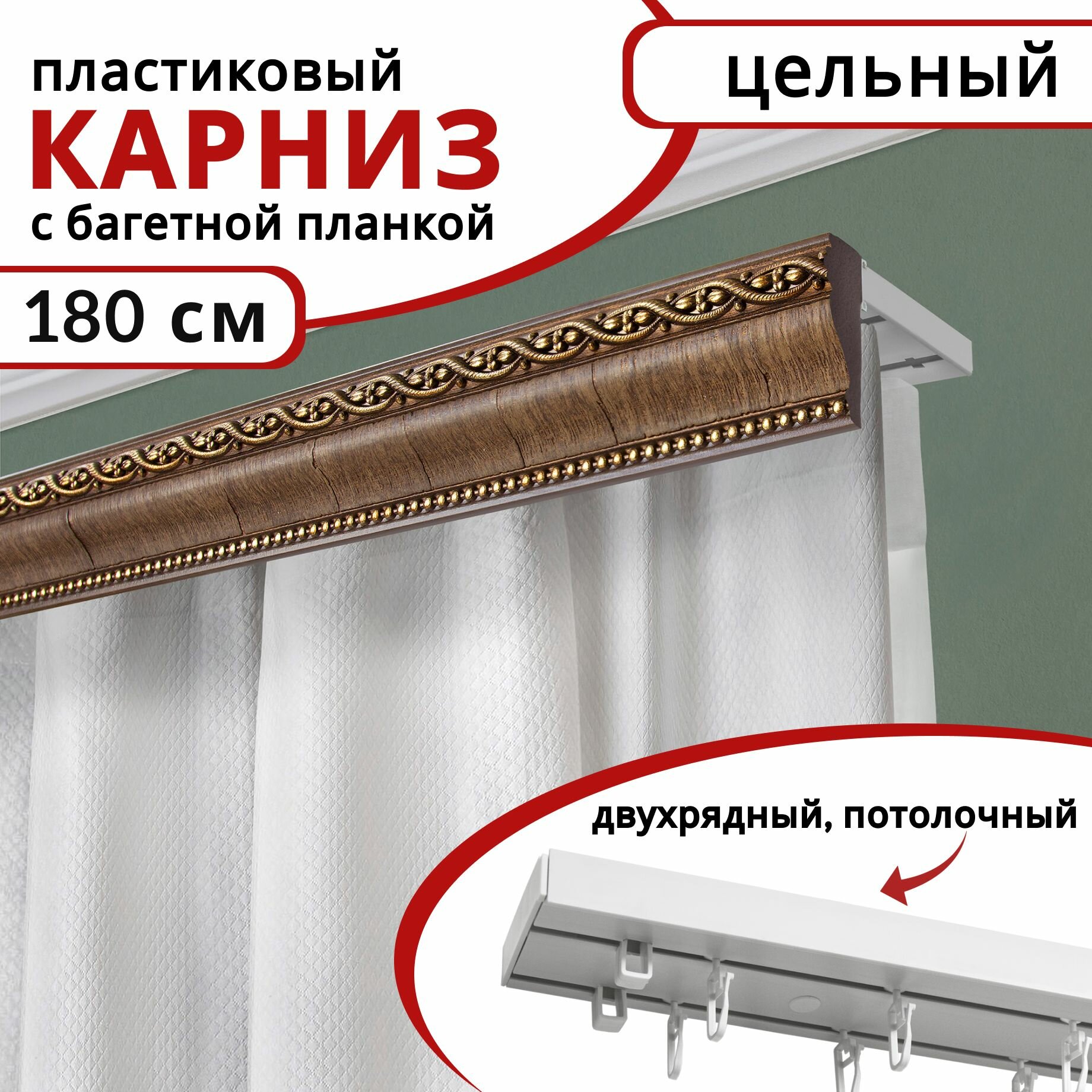 Карниз для штор и гардин двухрядный потолочный с багетной планкой 180 см, цвет Красное дерево