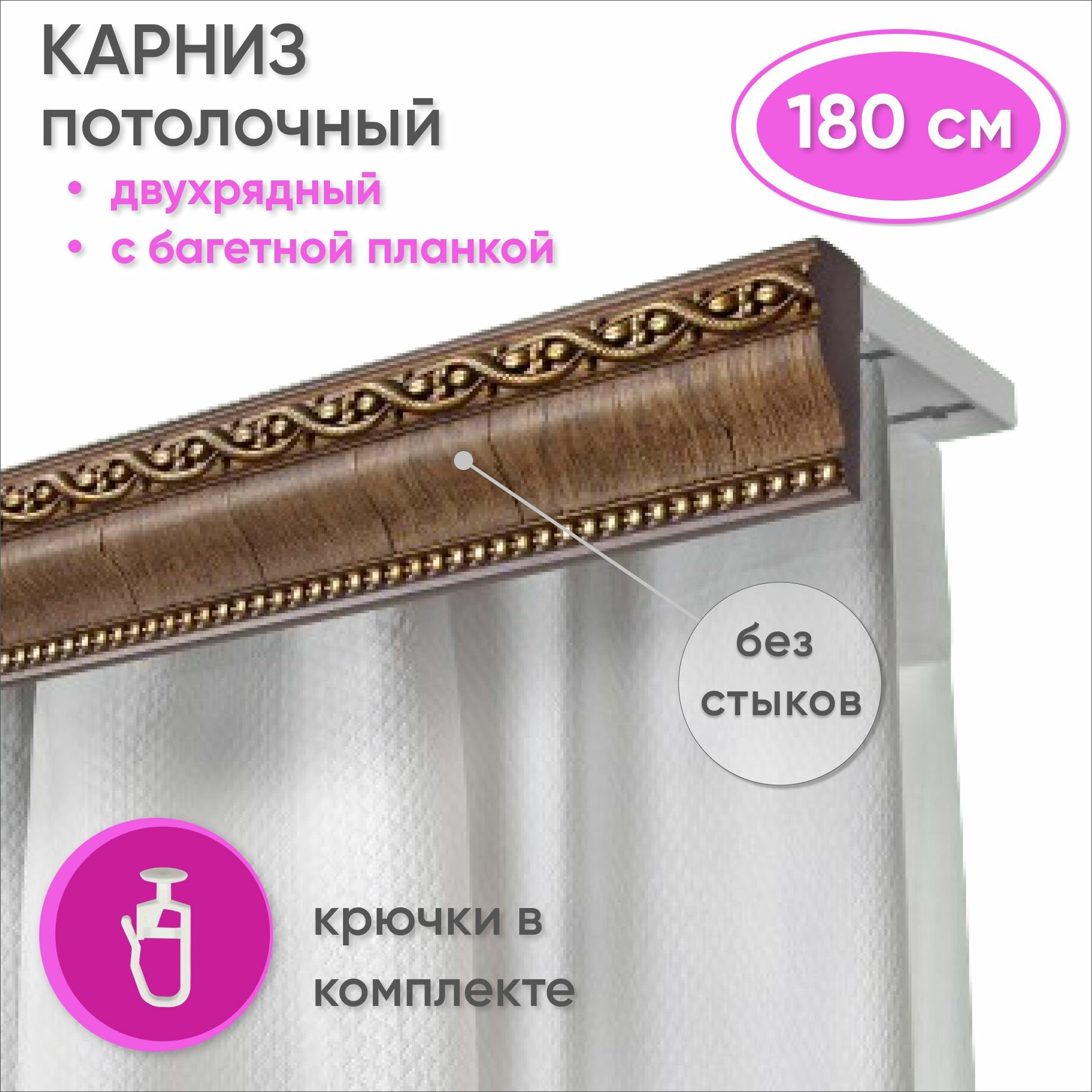 Карниз для штор и гардин двухрядный потолочный с багетной планкой 180 см, цвет Темный орех