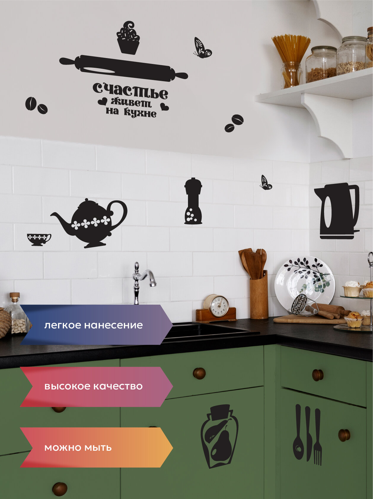 СохранитьНаклейка декоративная на стену, на фасад, на холодильник счастье живет на кухне интересное: