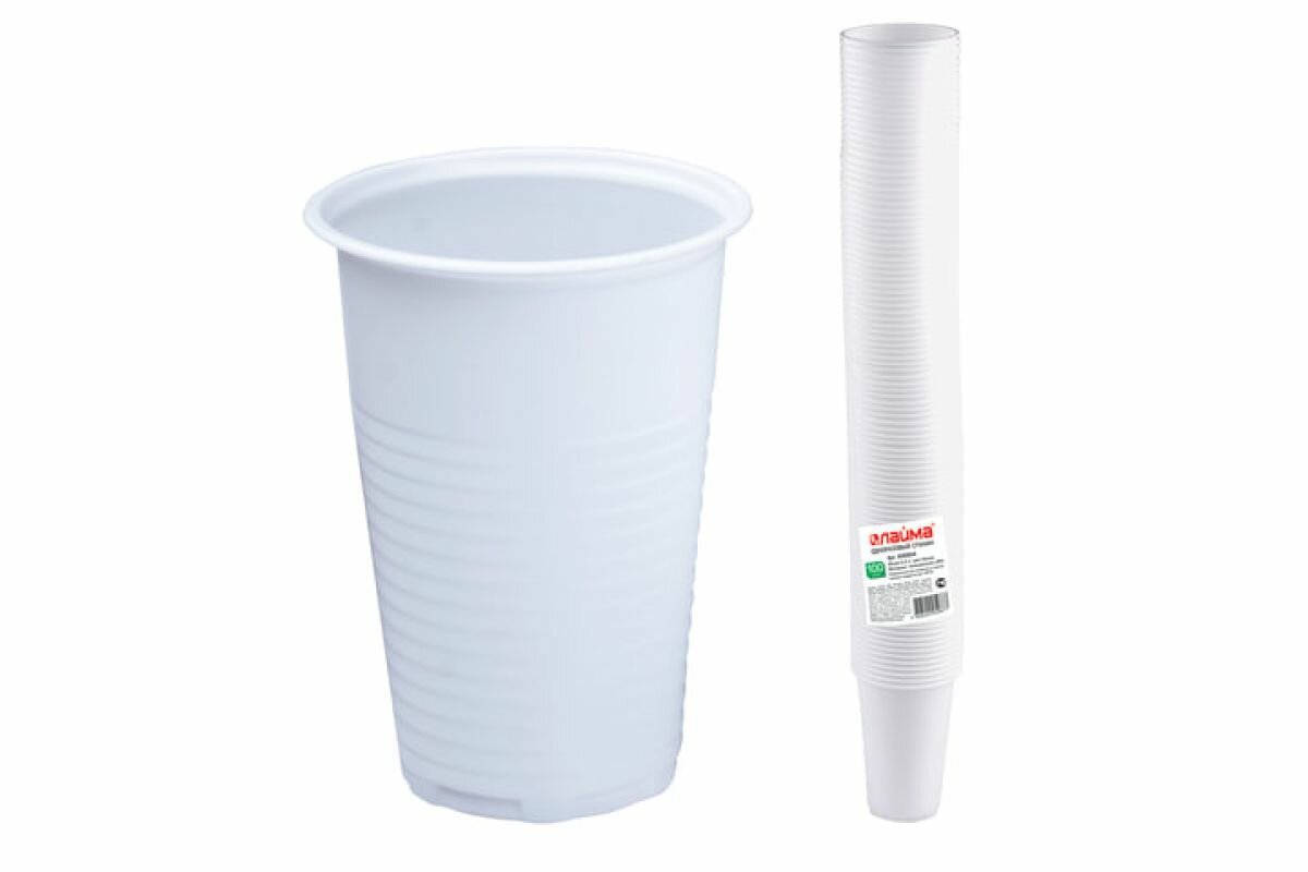 Стакан одноразовый, пластиковый 200 мл, комплект 100 шт., бюджет, белые, ПП, холодное/горячее, LAIMA, 600934, в наборе 2 компл. интересное: