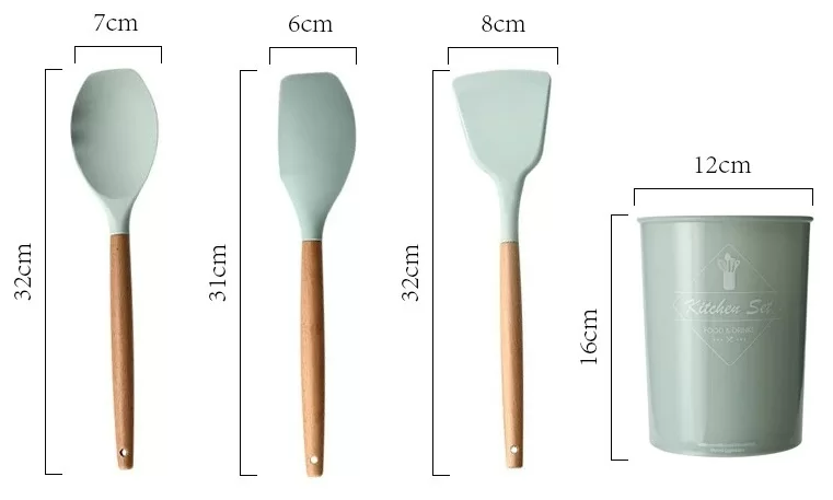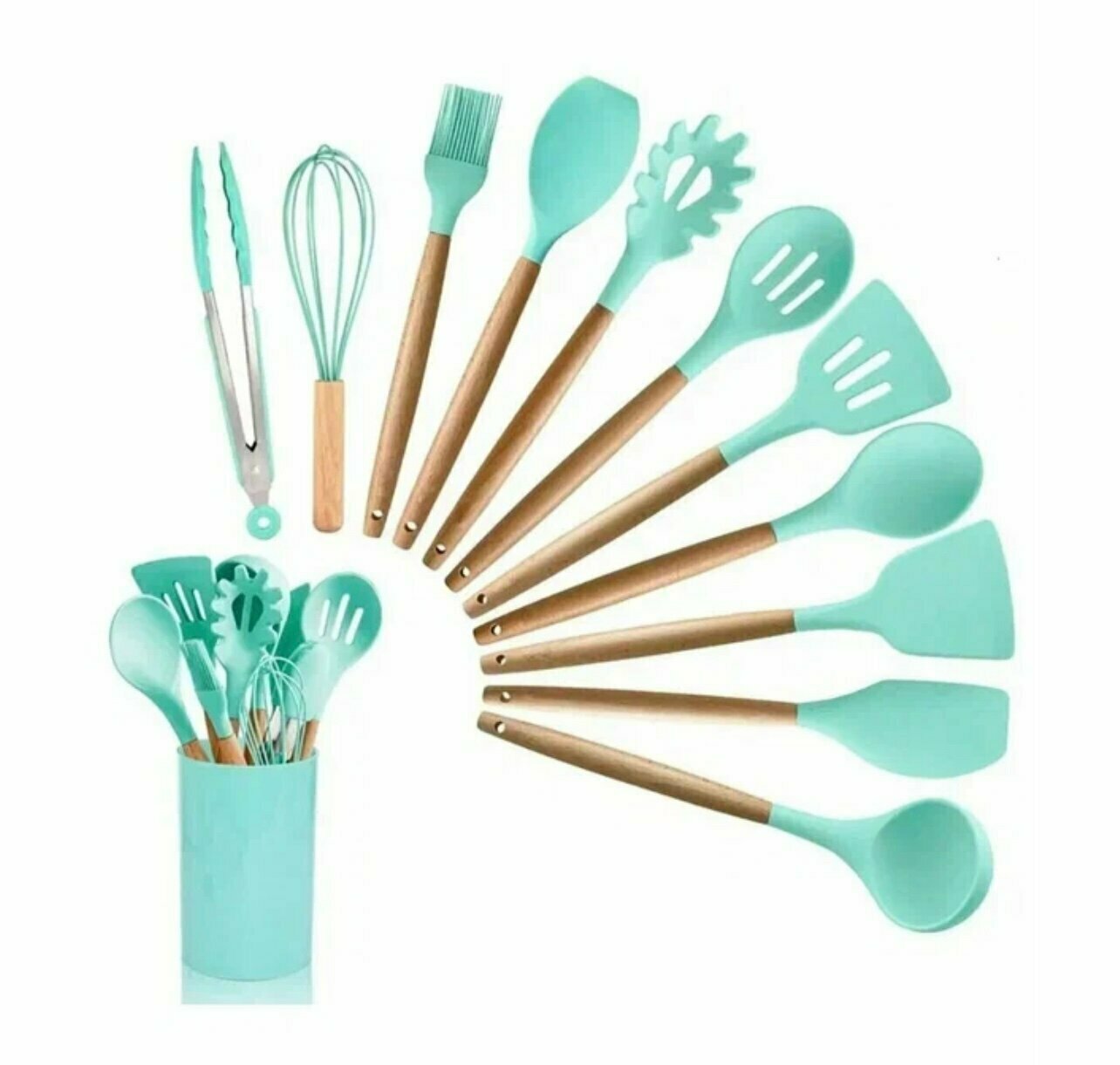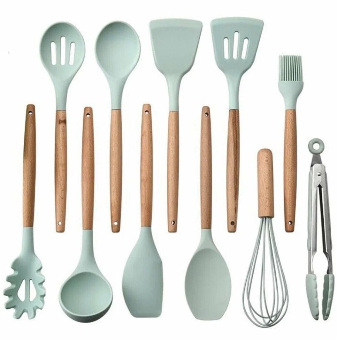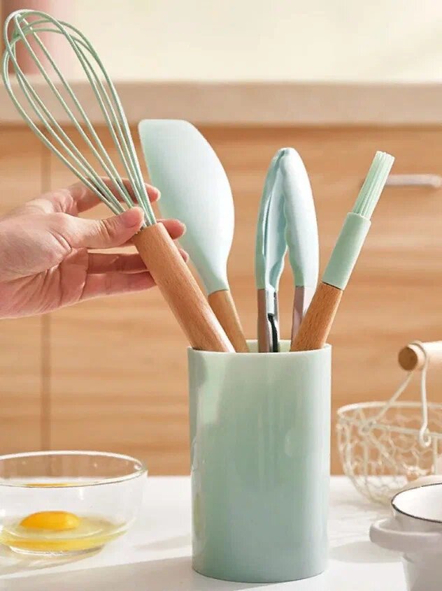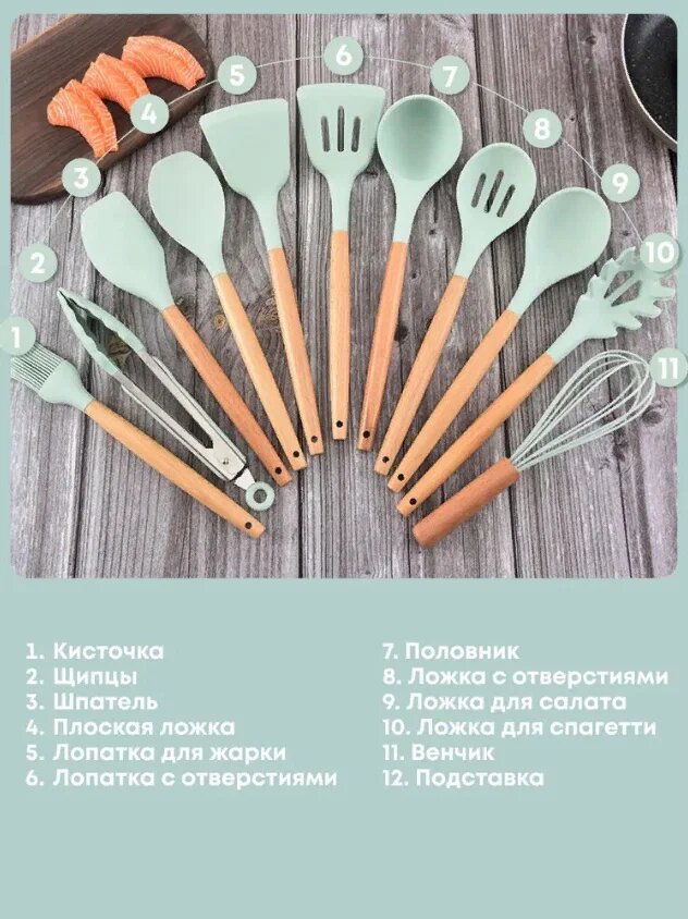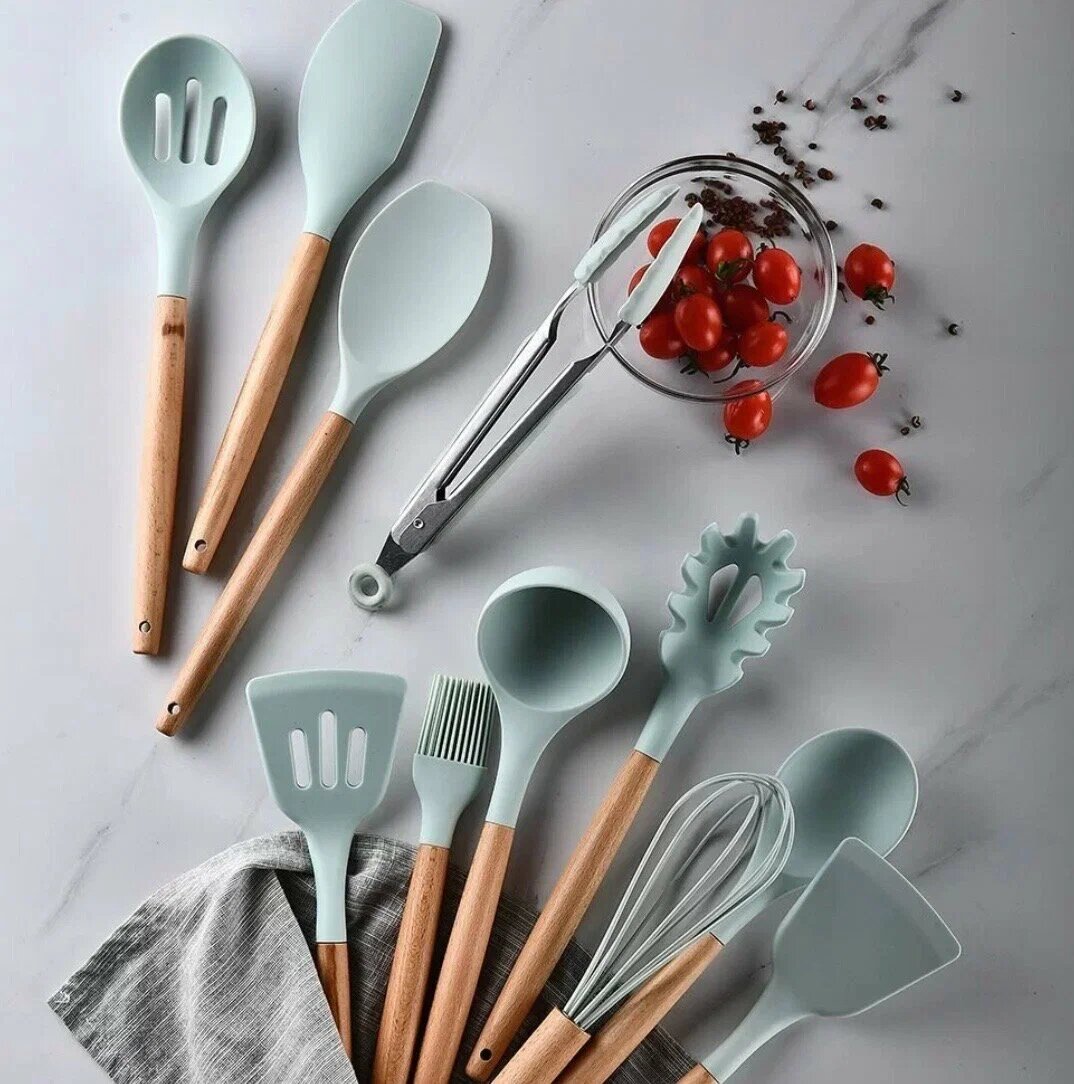 Кухонный набор Kitchen Set силикон и бамбук из 12 шт / цвет мятный.