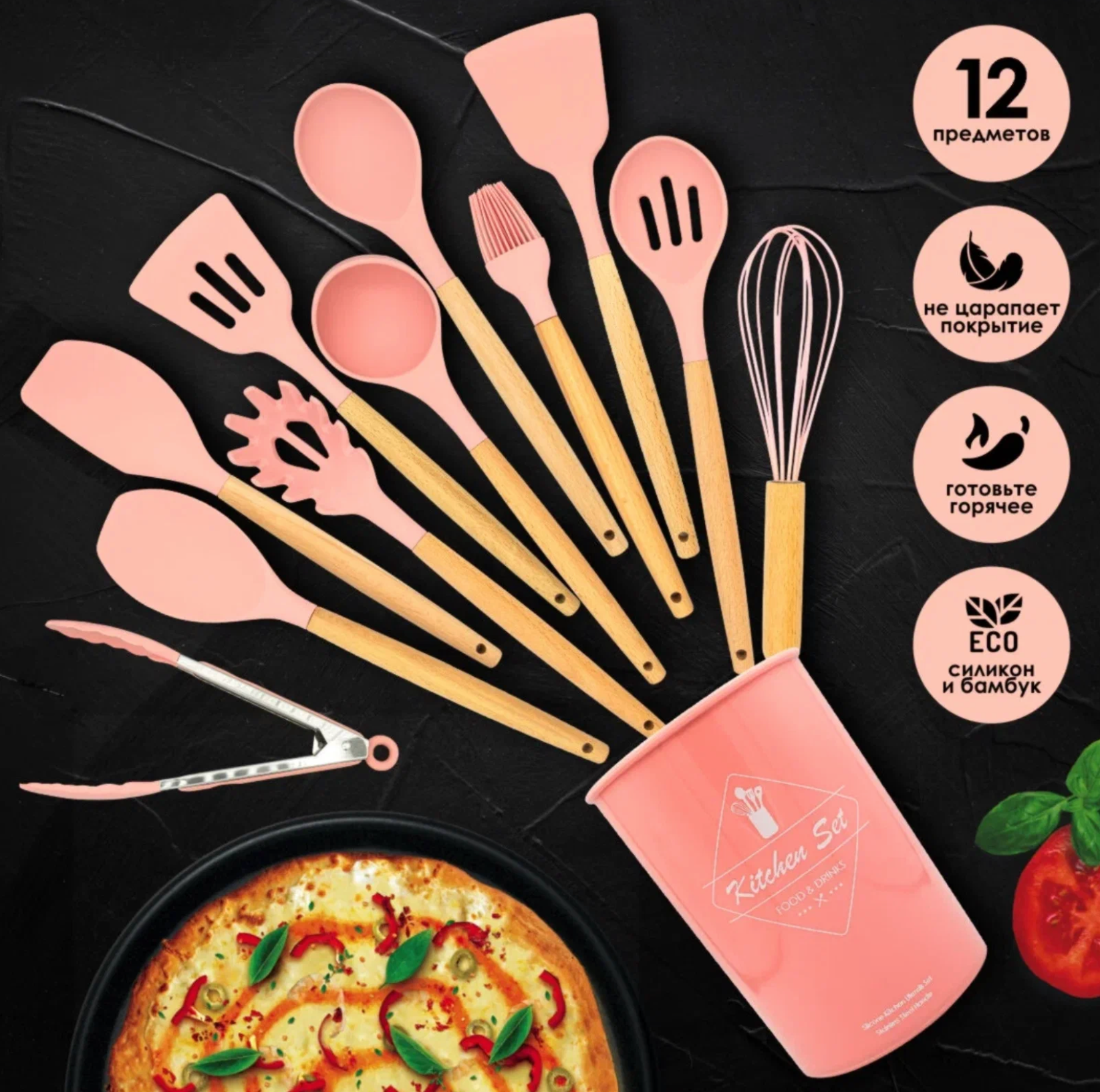 Набор кухонных принадлежностей Kitchen set из силикона и бамбука розовый