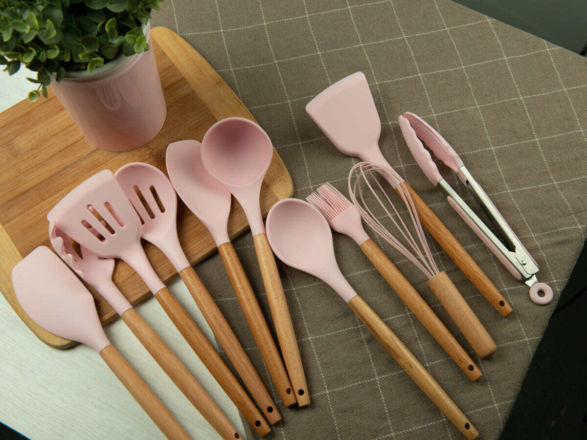 Купить Набор навесок / кухонных принадлежностей Kitchen Set силикон (11 шт + подставка) розовый
