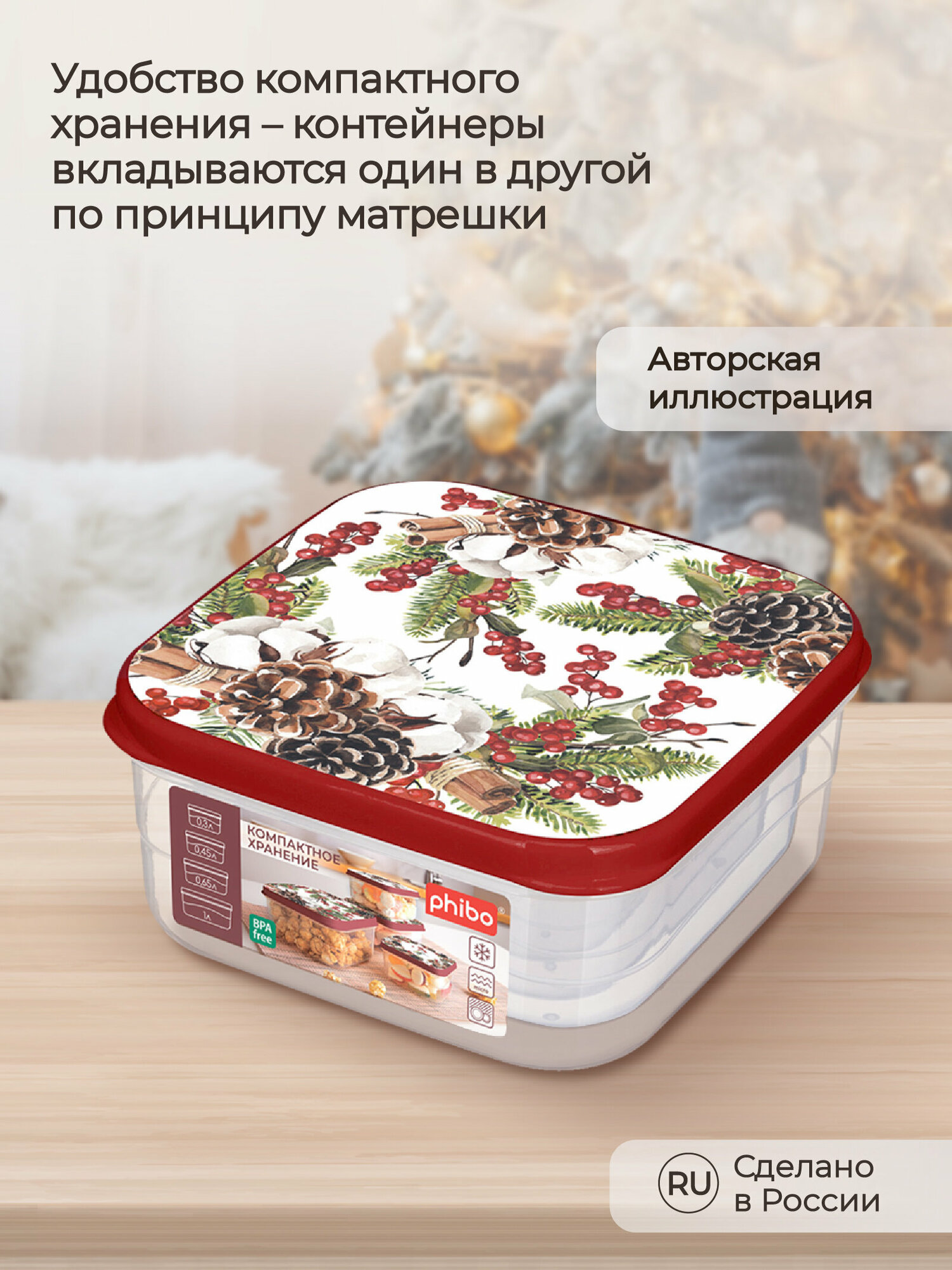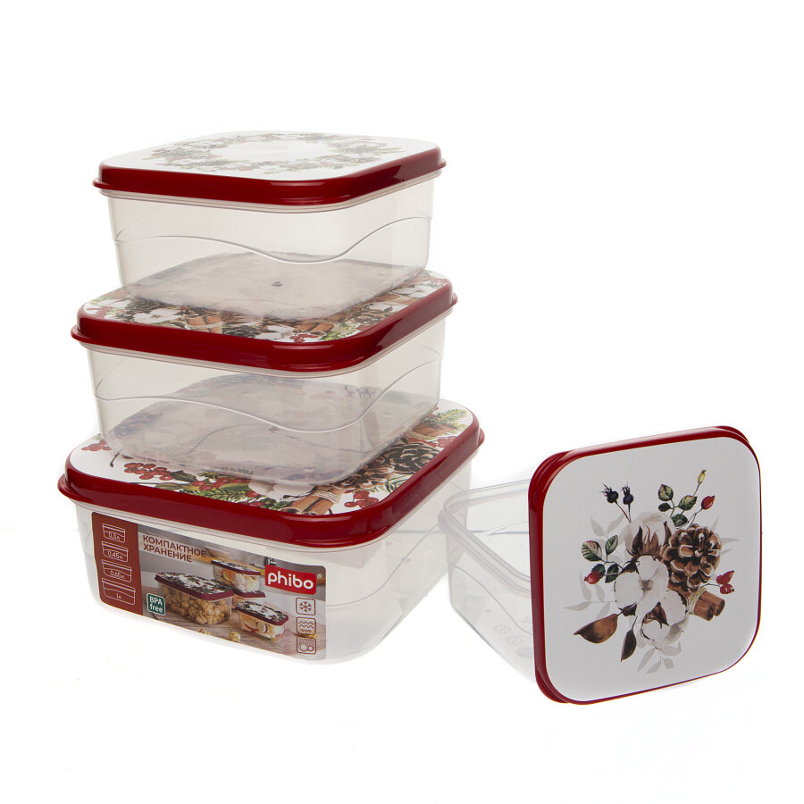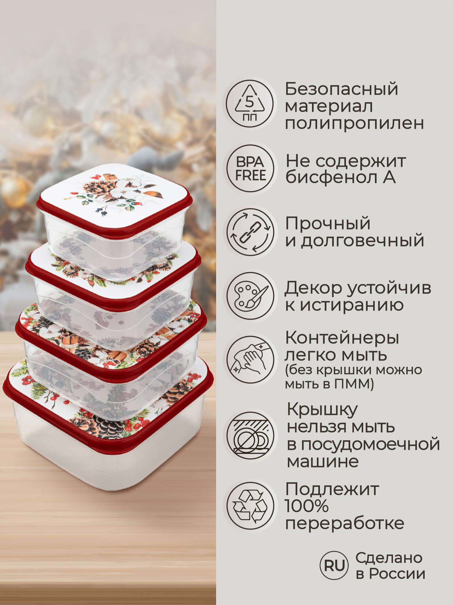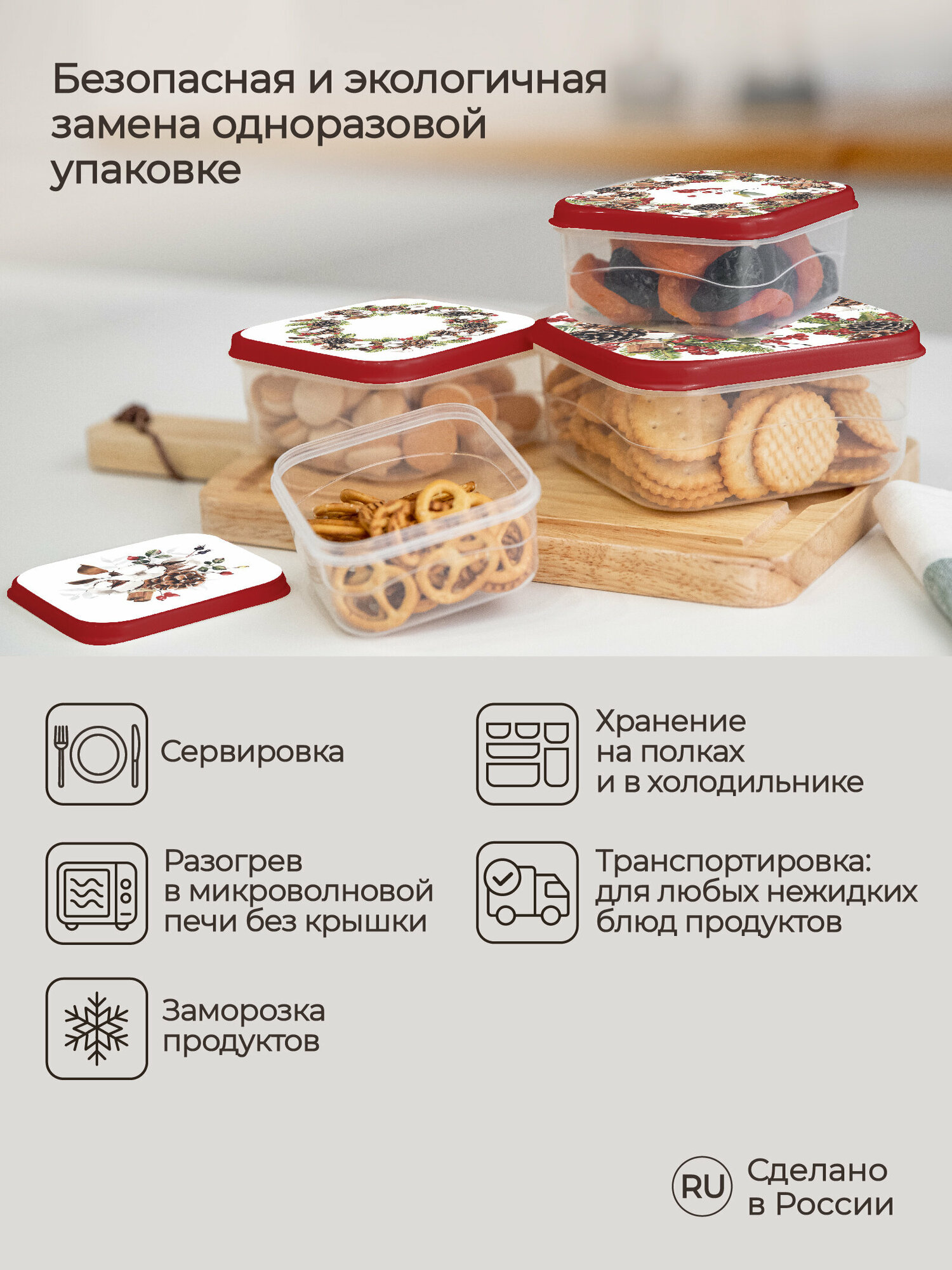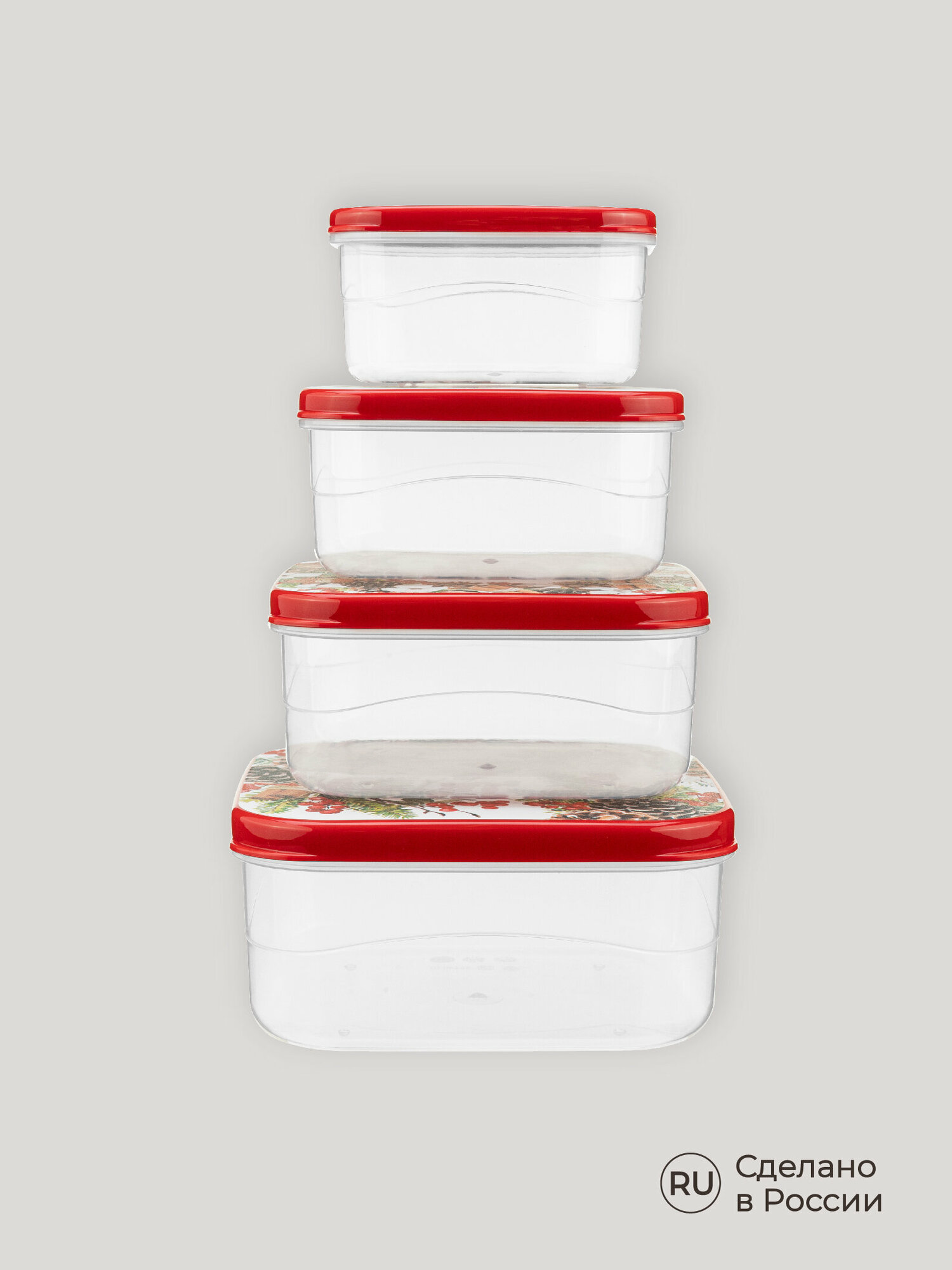 Комплект контейнеров для продуктов с декором 4шт 0,3л+0,45л+0,65л+1л (Бордовый) интересное: