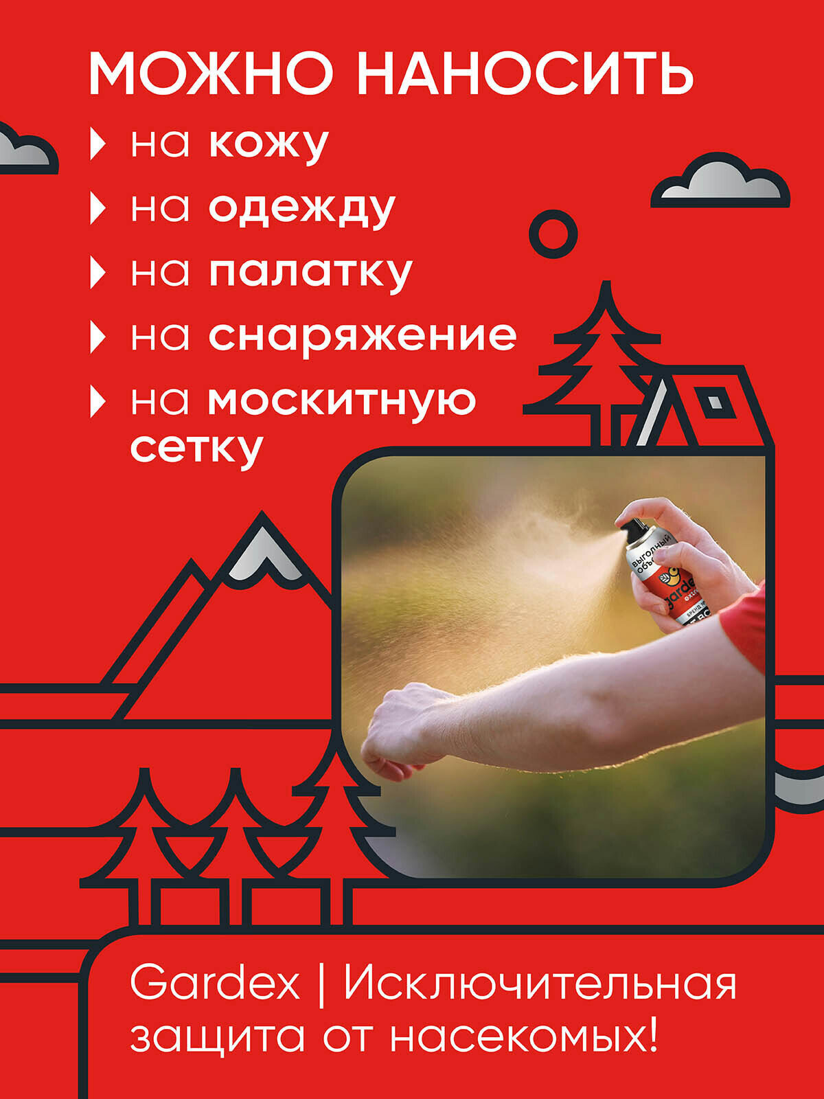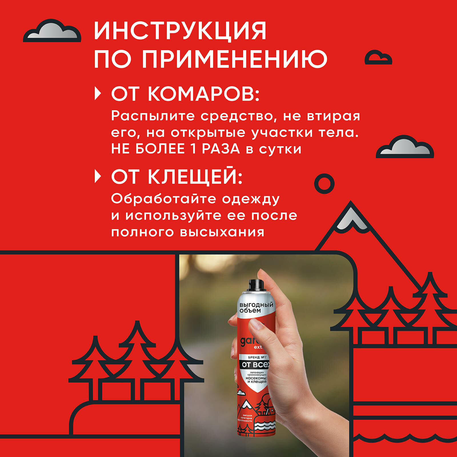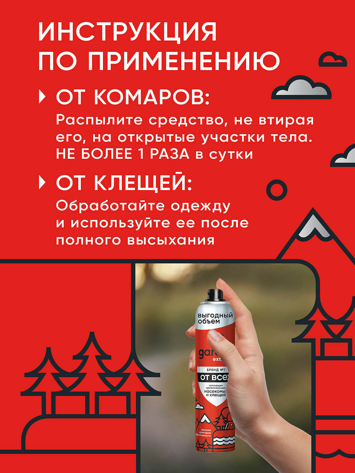 | Способ применения | Встряхнуть баллон перед применением. Обработку проводить на открытом воздухе. Для защиты от насекомых: распылить средство на ладонь и нанести, не втирая, на открытые участки тела. Можно наносить на одежду и снаряжение из натуральных тканей. После работы со средством тщательно вымыть руки с мылом. Для защиты от клещей: обрабатывать весь комплект одежды до легкого увлажнения, не надевать ее до полного высыхания. |