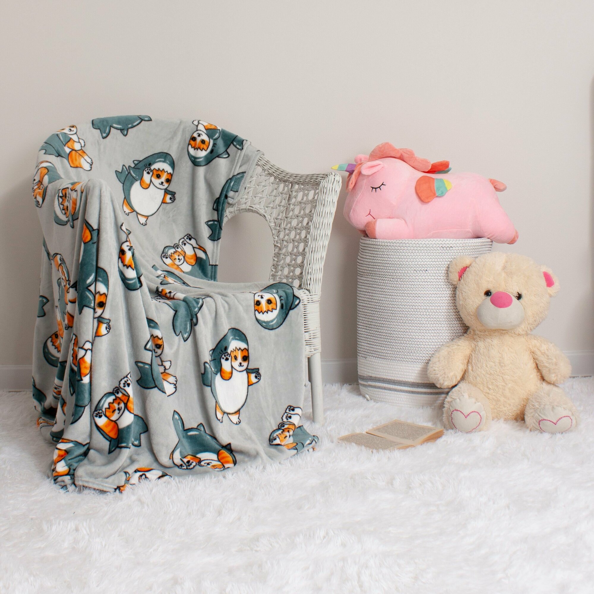 СохранитьДетский плед из микрофибры с рисунком кот-акула, 150х200 см, серый интересное: