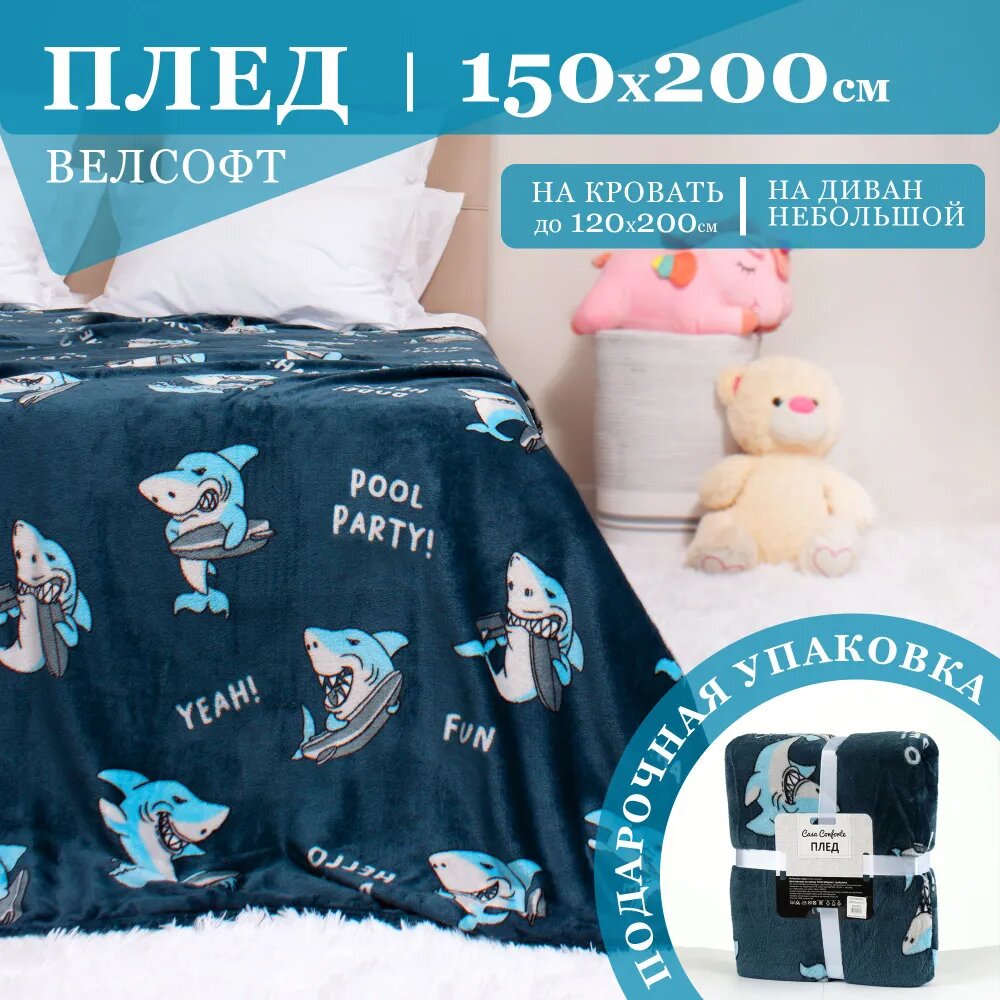 Купить Плед велсофт детский 150х200 см Casa Conforte Фестиваль Акула, синий