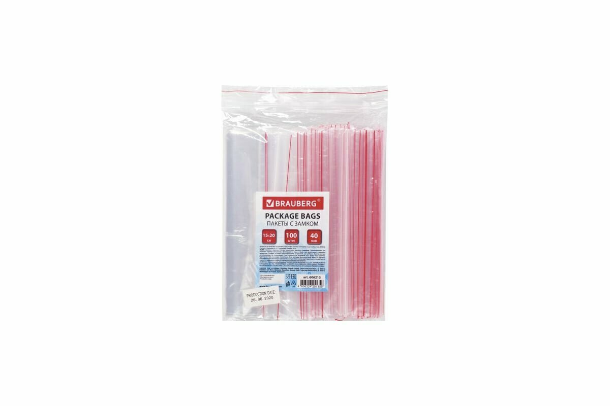 BRAUBERG Пакеты с замком зиплок гриппер комплект 100 шт. 150х200 мм ПВД толщ. 40 микр606213 606213
