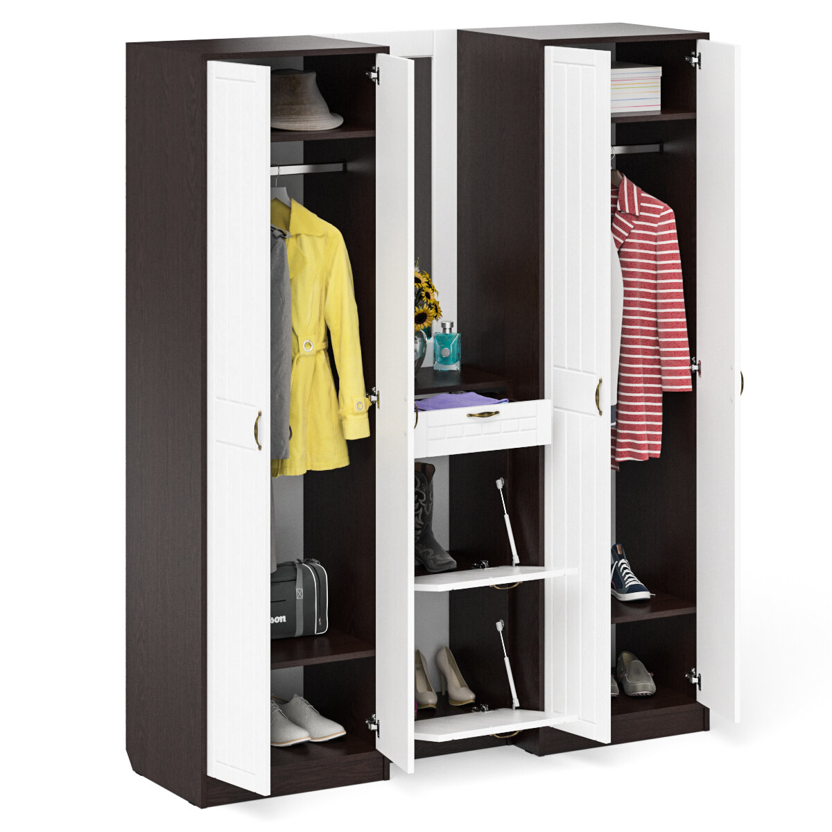 | Состав комплекта | состоит из двух шкафов для одежды объединенных в единый блок / высокой обувницы и навесного зеркала |