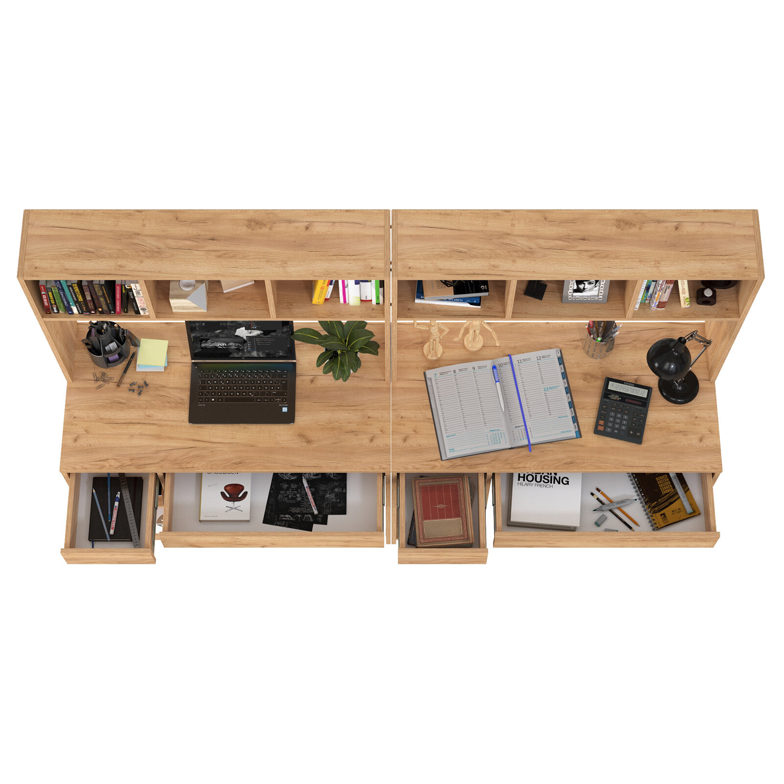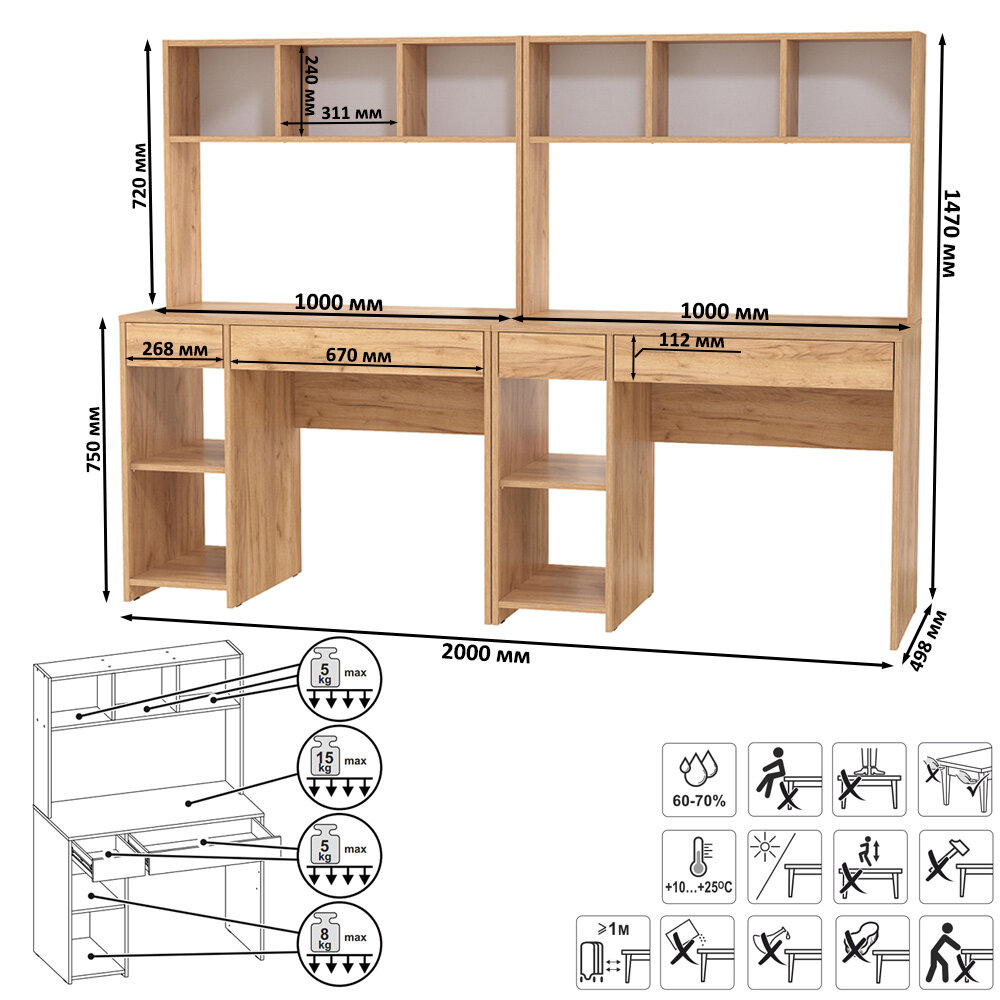 | Дополнительная информация | располагает большими столешницами и вместительной системой хранения для двоих деток, система хранения каждого стола разнообразна - это надстройка с открытыми нишами, открытая тумба со съёмной полкой и два выдвижных ящика стола, защитная ниша надстройки вполне достаточна для установки монитора любого размера, а тумба подойдёт для установки системного блока, стол с множеством открытых ниш, визуально лёгкий, привлекает эргономичностью и стильным дизайном, собираются на любую сторону - при сборке Вы можете расположить тумбу как слева, так и справа |