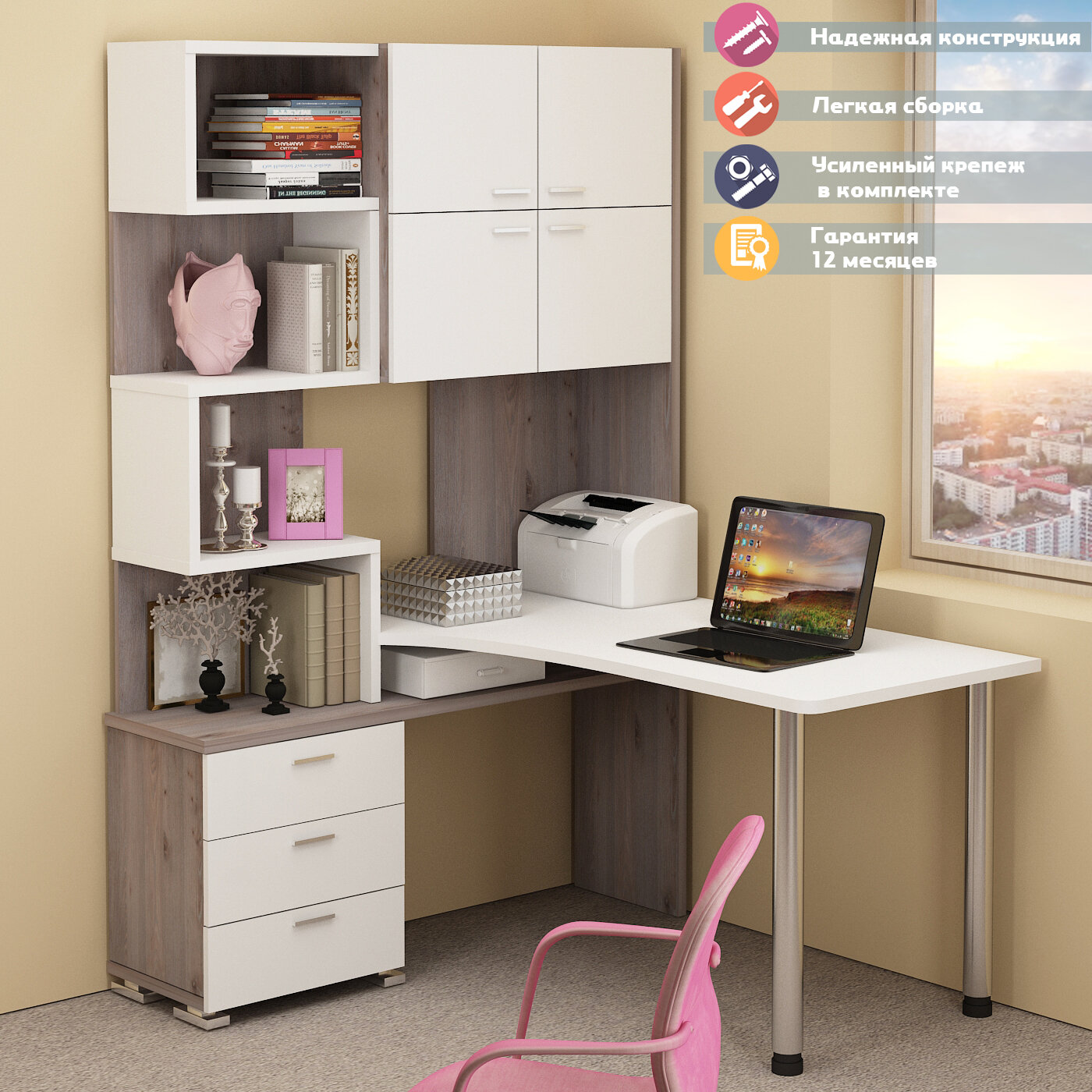 Стол компьютерный Мэрдэс СР-500М/140 БЕ-ПРАВ Белый, с надстройкой, угловой, 130х140х199 см