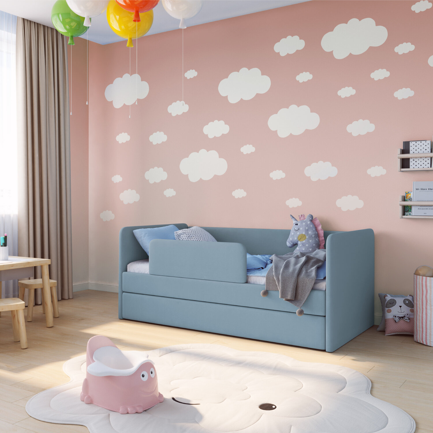 Детская кровать диван 180х80 Romack Jenny с бортиком и ящиком, с мягким изголовьем, цвет: Голубой микровелюр