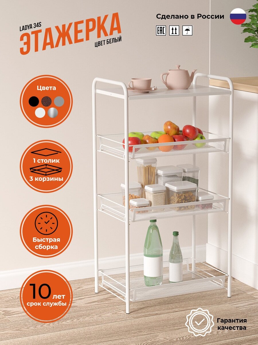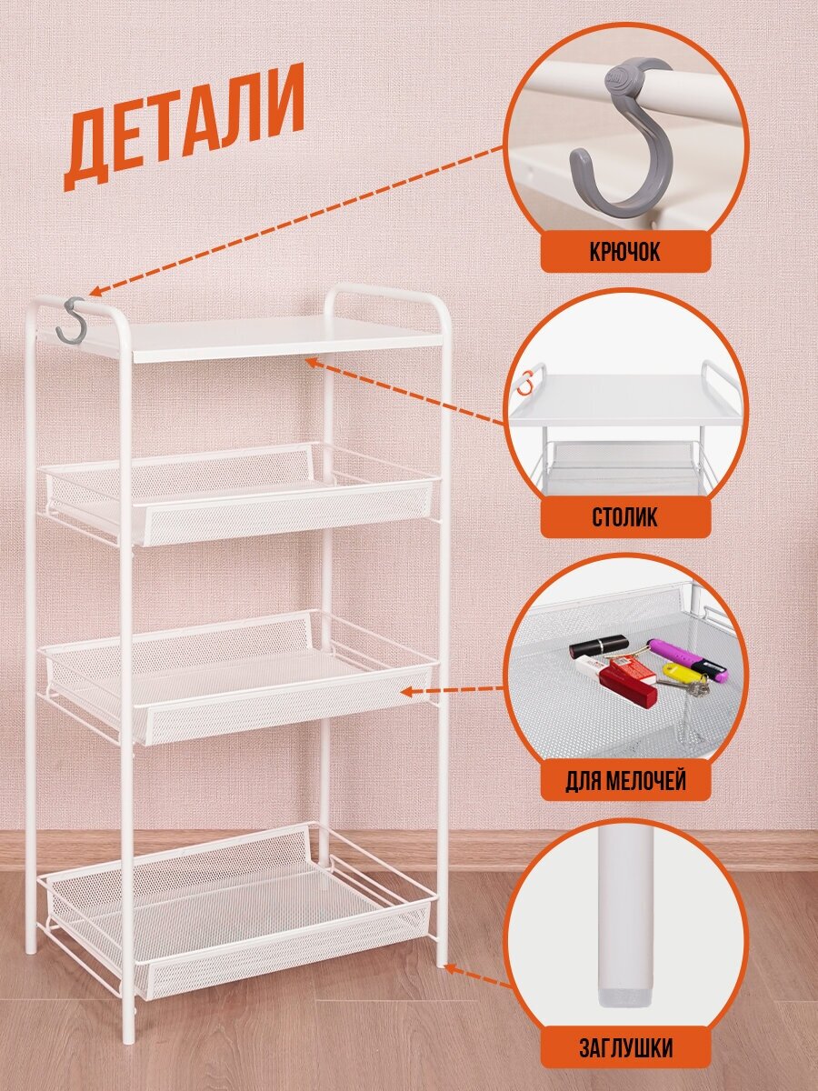 | Дополнительная информация | Этажерка имеет 3 широкие корзины и удобный металлический столик, увеличенное расстояние между нижними корзинами для высоких предметов, пластиковый крючок для мелочей |