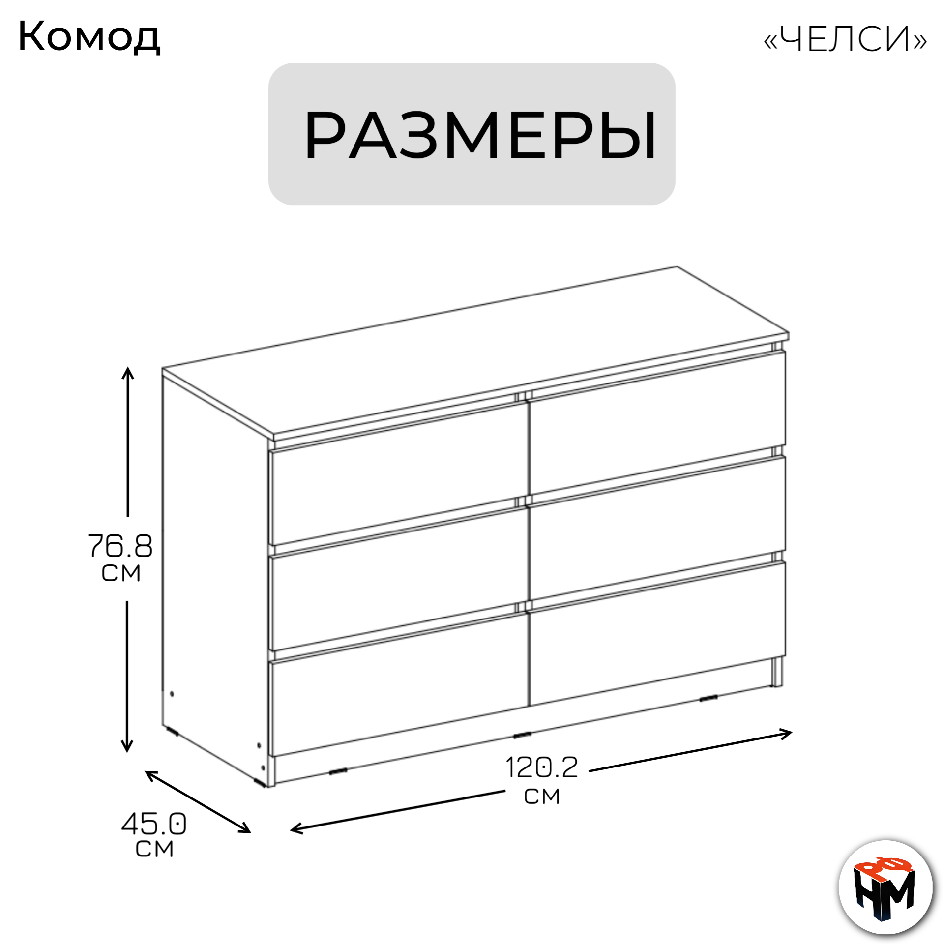 Комод Челси с 6 ящиками, 120х46х77 см, серый цвет, ЛДСП, фасад - графит