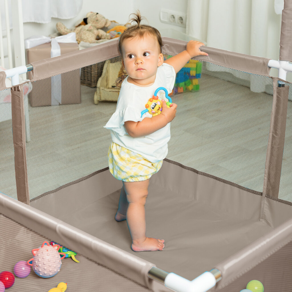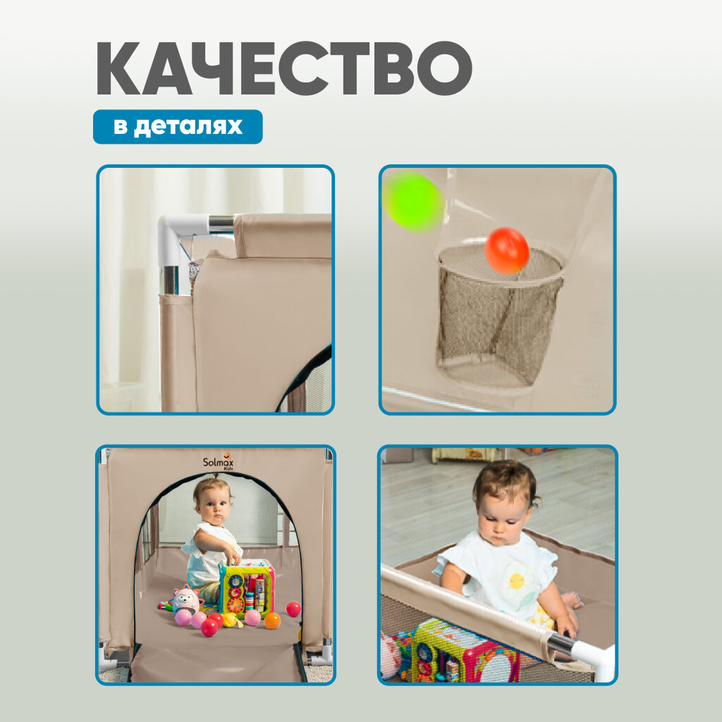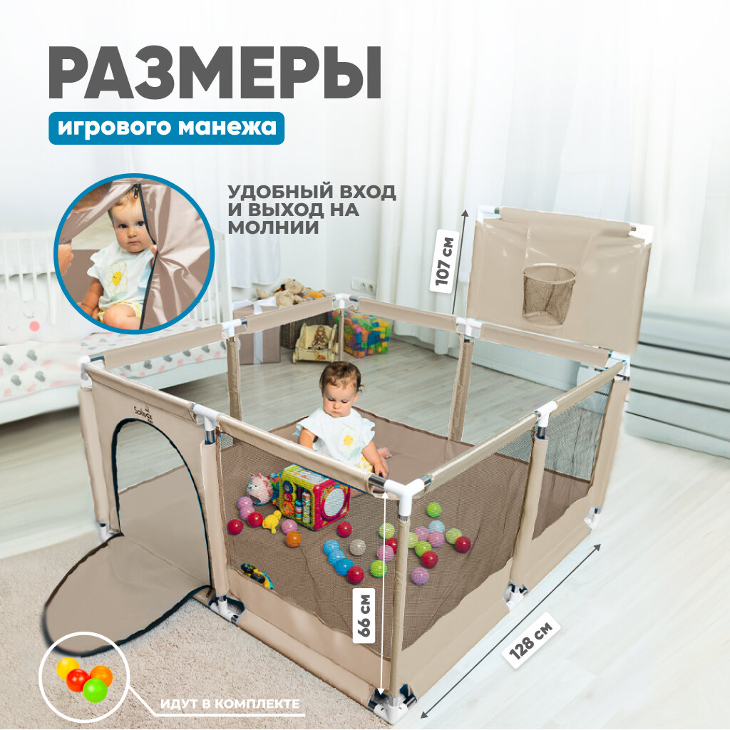 Детский игровой манеж SOLMAX с баскетбольным кольцом квадратный с шариками, бежевый интересное:
