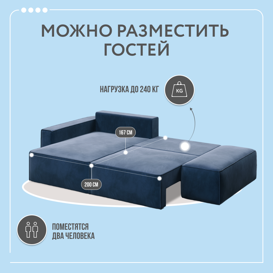 Угловой диван-кровать двухспальный с банкеткой D1 Корсо в гостиную, синий, 269x176x80