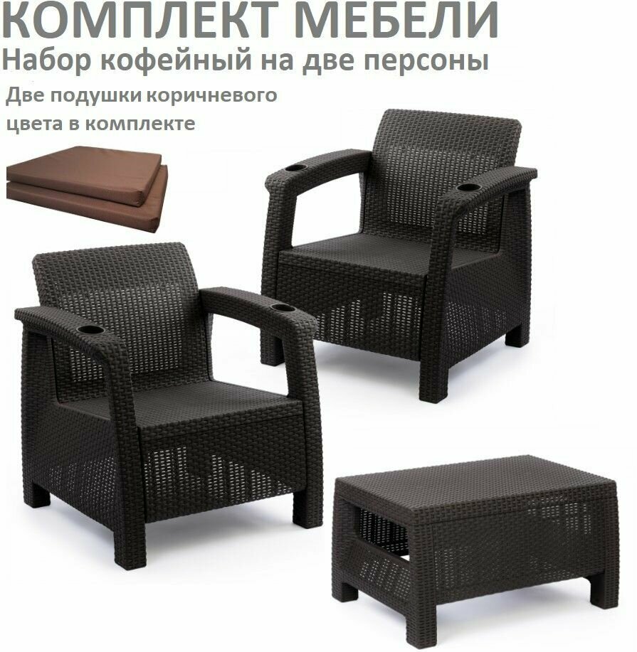 Купить Садовая мебель. Набор кофейный на 2 персоны (2 кресла + кофейный столик), мокко, с коричневыми подушками