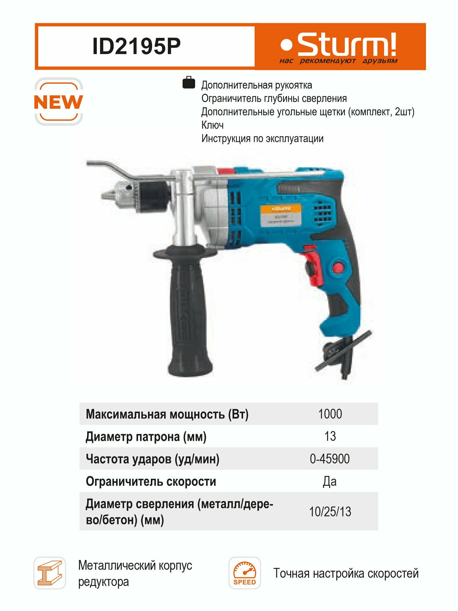 ID2195P Дрель ударная "профи" 1000Вт, 2700об/мин, 45900уд/мин, металлич.корпус редуктора,Sturm! Sturm!
