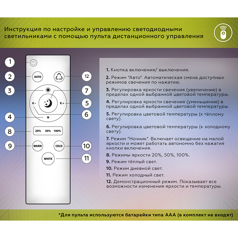 | Управление | механическое / пульт дистанционного управления / регулировка яркости диммером / управление со смартфона |