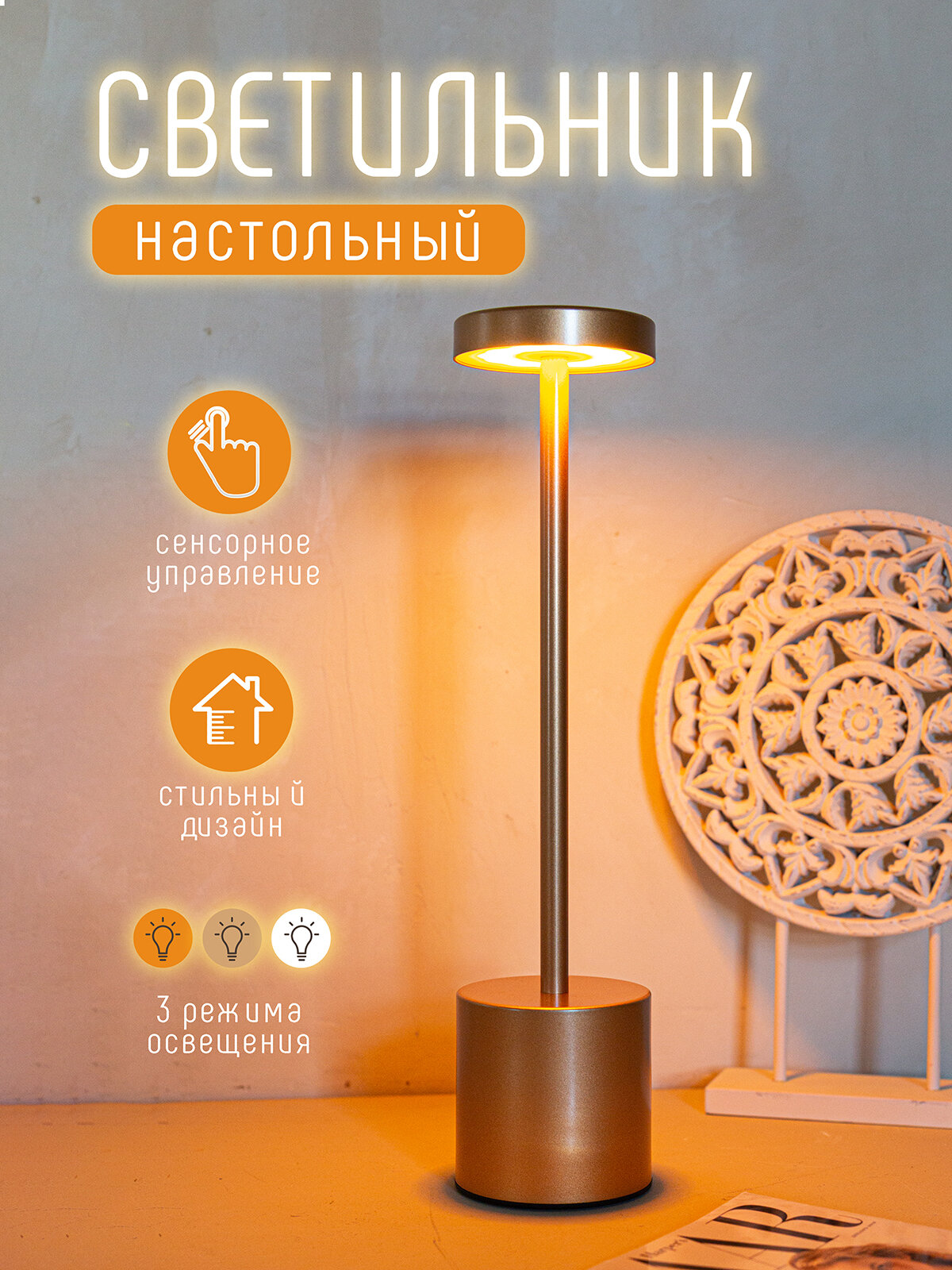 Светильник настольный светодиодный беспроводной, торшер интерьерный, лампа LD сенсорная, цвет золото