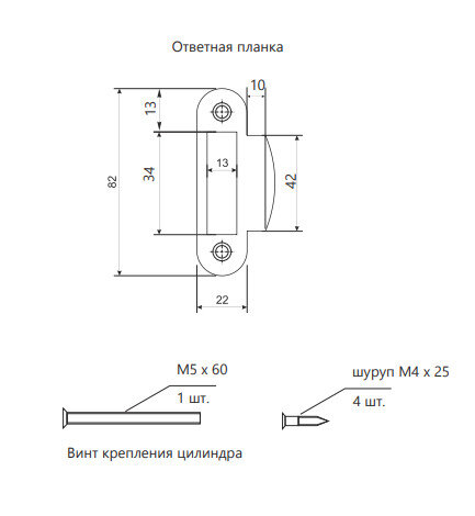 | Подробная комплектация | 1. Корпус защелки 1 шт. 2. Ответная планка 1 шт. 3. Вкладыш под ответную планку 1 шт. 4. Комплект крепежа 1 шт. 5. Паспорт 1 шт. |