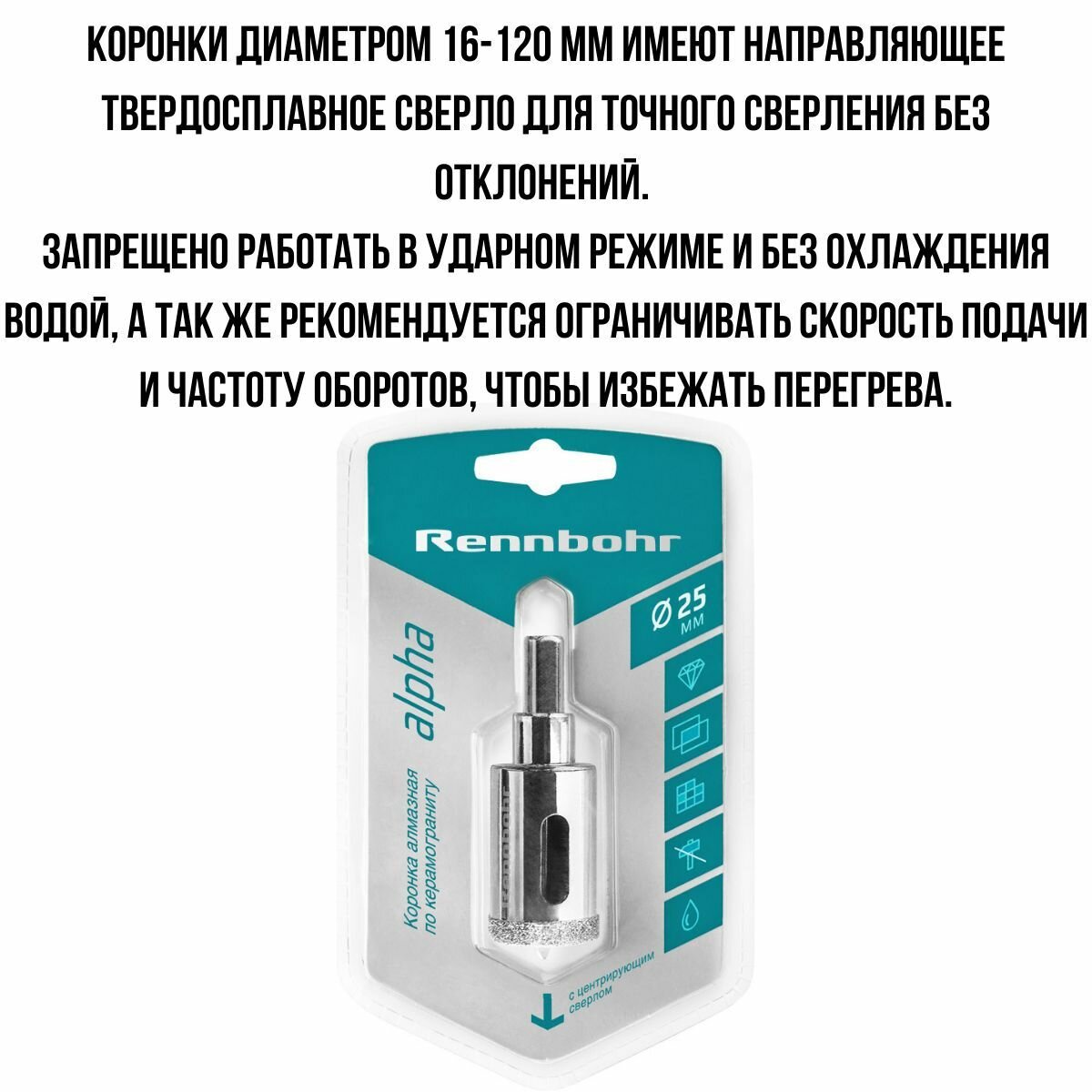 | Дополнительная информация | Коронка алмазная RENNBOHR 25мм с центрирующим сверлом |