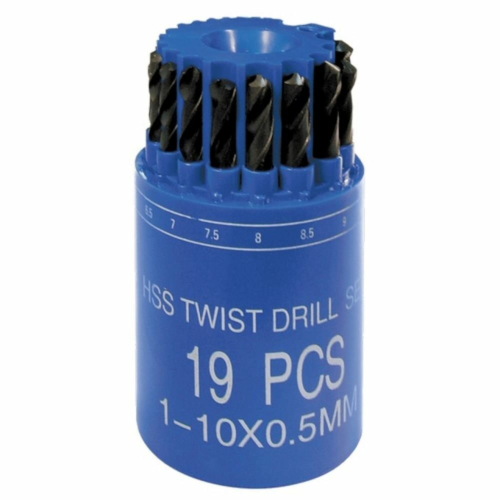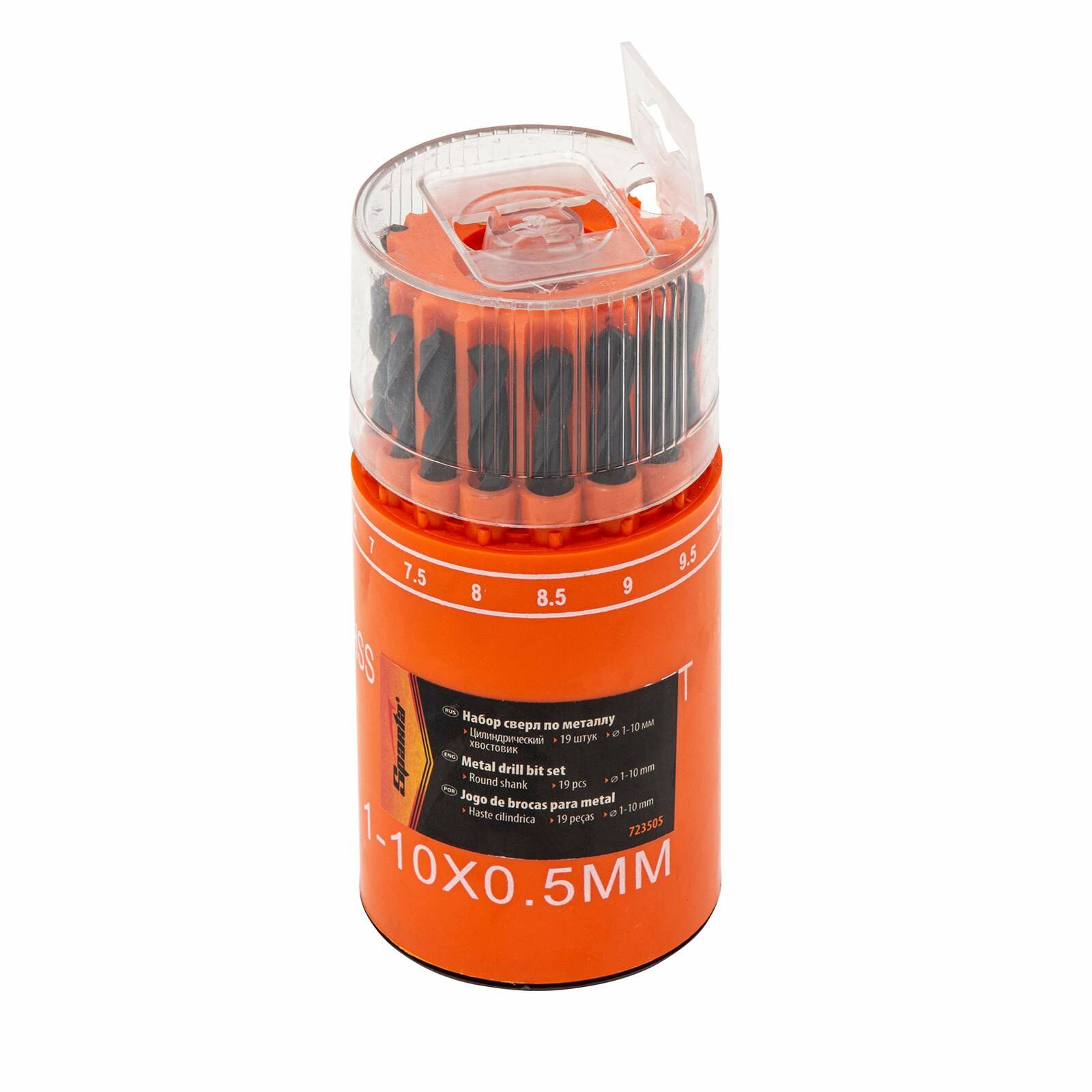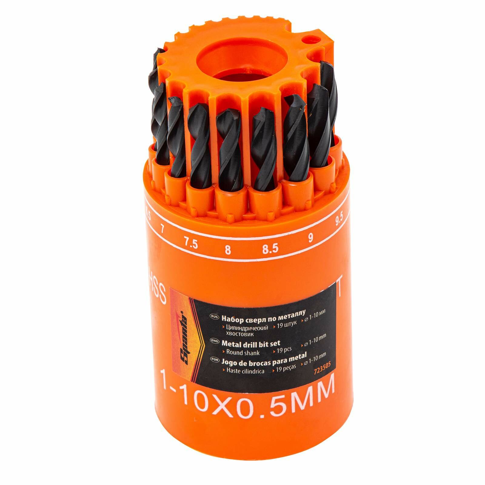 Набор сверл по металлу Sparta 1-10 мм (через 0, 5 мм), HSS, 19 шт, в стакане, цилинд. хвостовик 723505