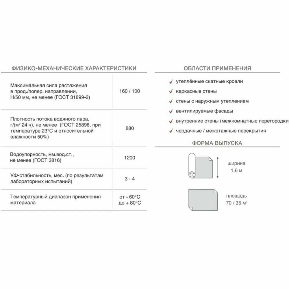| Тип изоляции | ветроизоляция / гидроизоляция / пароизоляция |