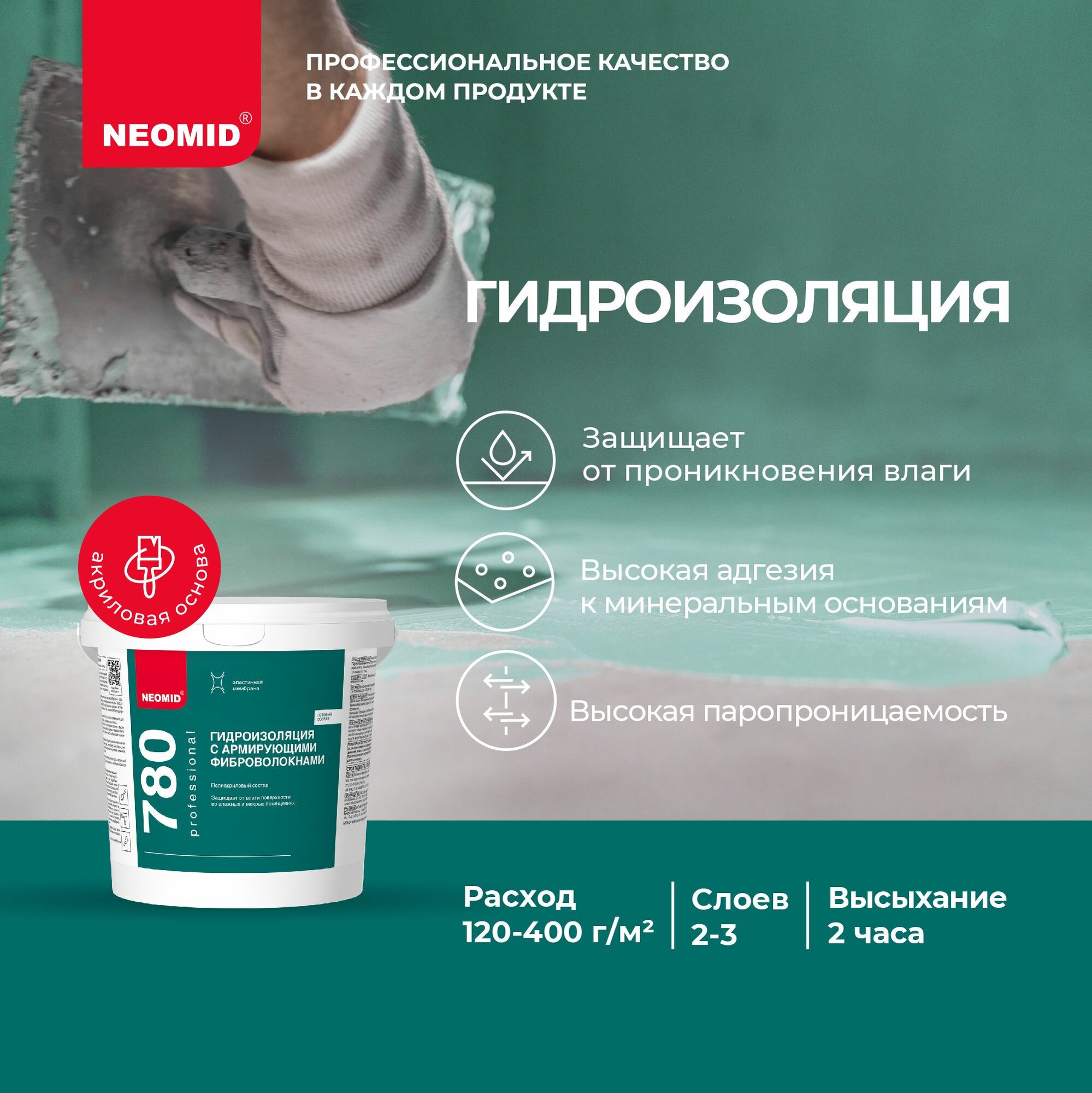 Гидроизоляция Neomid 12кг с Армирующими Микроволокнами для Создания Сплошной Бесшовной Гидроизоляции / Неомид.