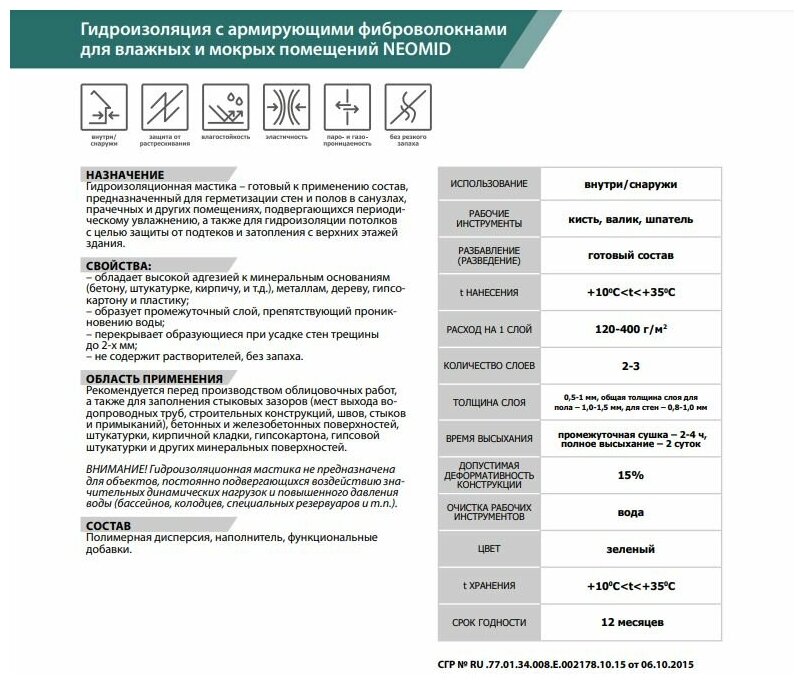 | Дополнительная информация | расход при однослойном нанесении: 120-400 г/кв.м; цвет: зеленый; температура нанесения: не ниже +10°C и не выше +35°C; не содержит растворителей; без запаха |