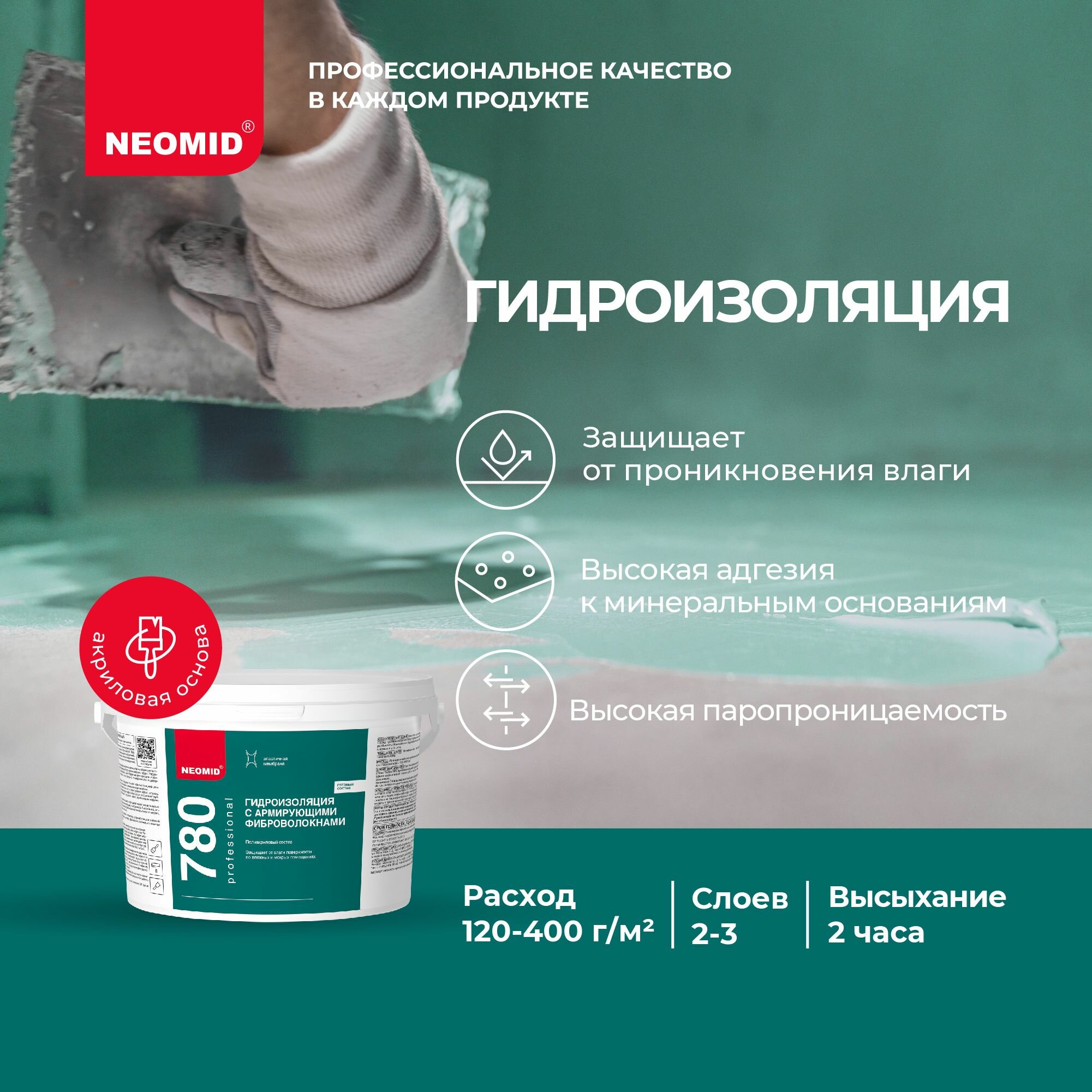 Мастика гидроизоляционная Neomid 780, с армирующими фиброволокнами, 12 кг