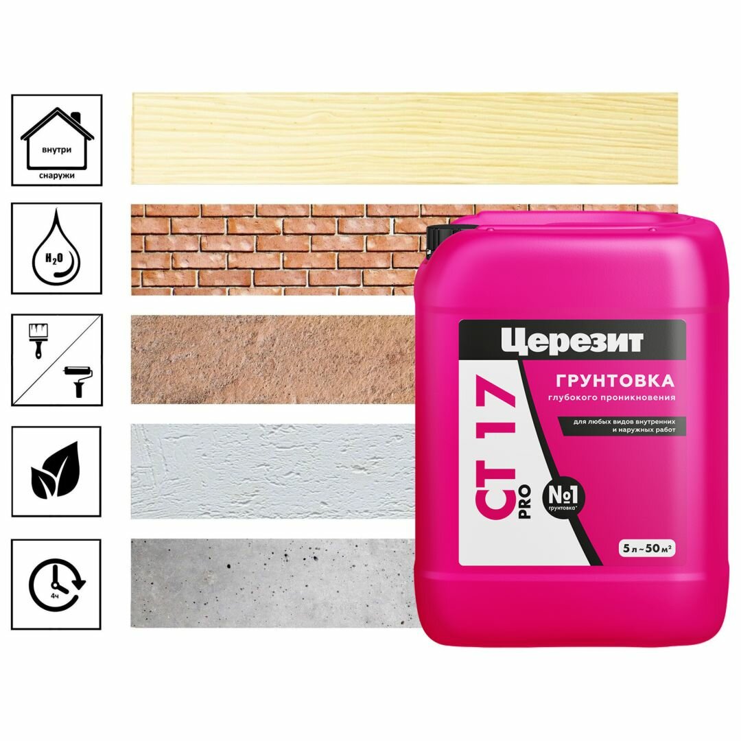 Грунтовка Церезит CT17 PRO универсальная, адгезионная, глубокого проникновения, укрепляющая, 5 л