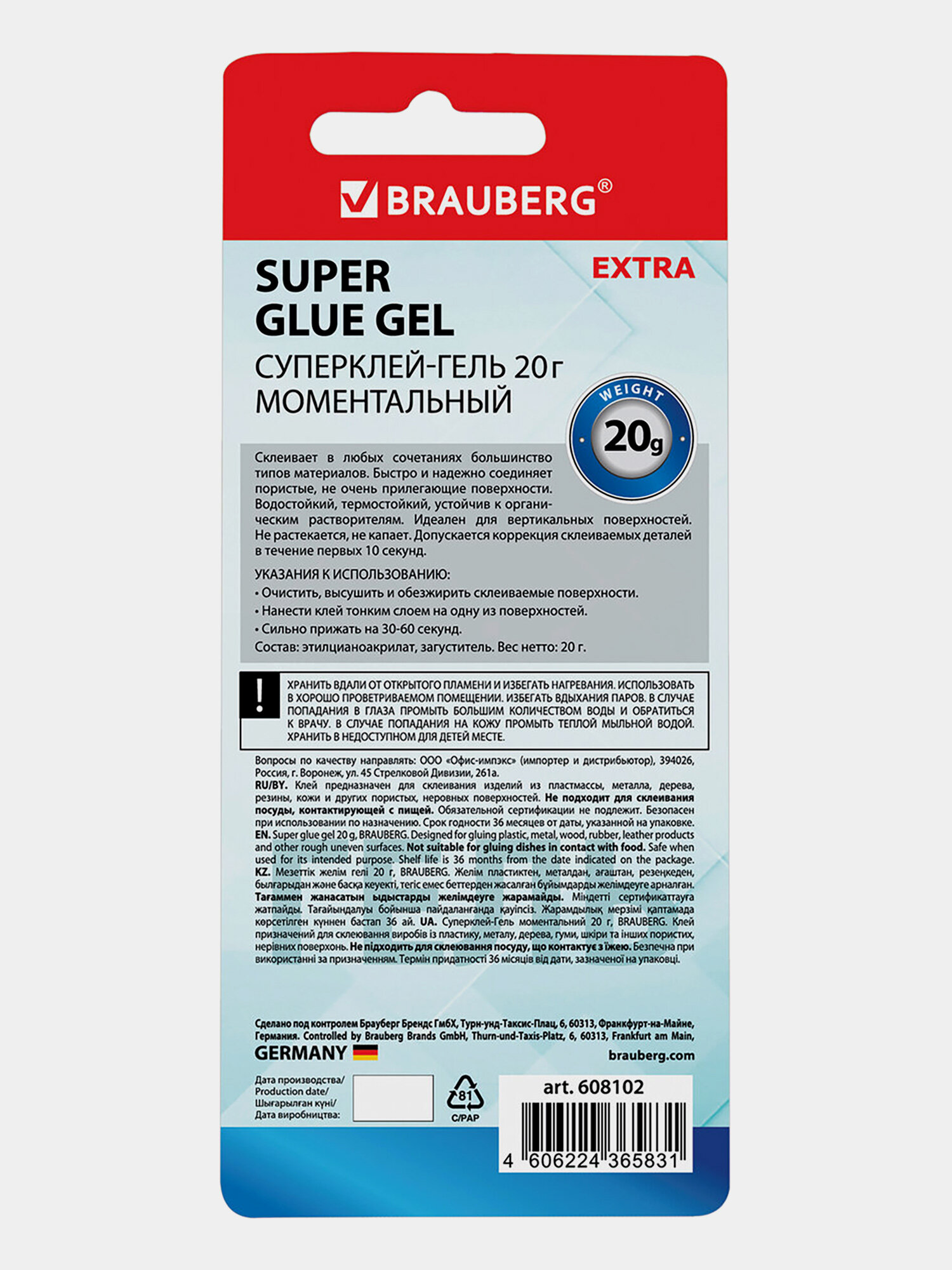 Купить Клей-Гель моментальный ультрапрочный суперклей BRAUBERG EXTRA, 20 г, максимальный объем, 608102
